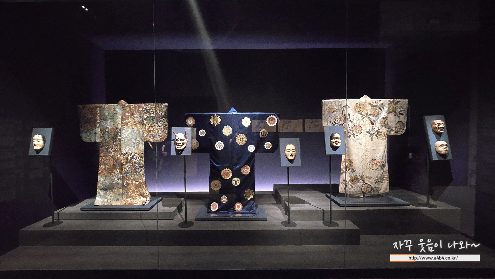 일본미술, 네 가지 시선 전시회 섹션 3 공간은 좌우에 대형 병풍이 전시되어 있고, 정면에 옷 한벌이 보입니다.
