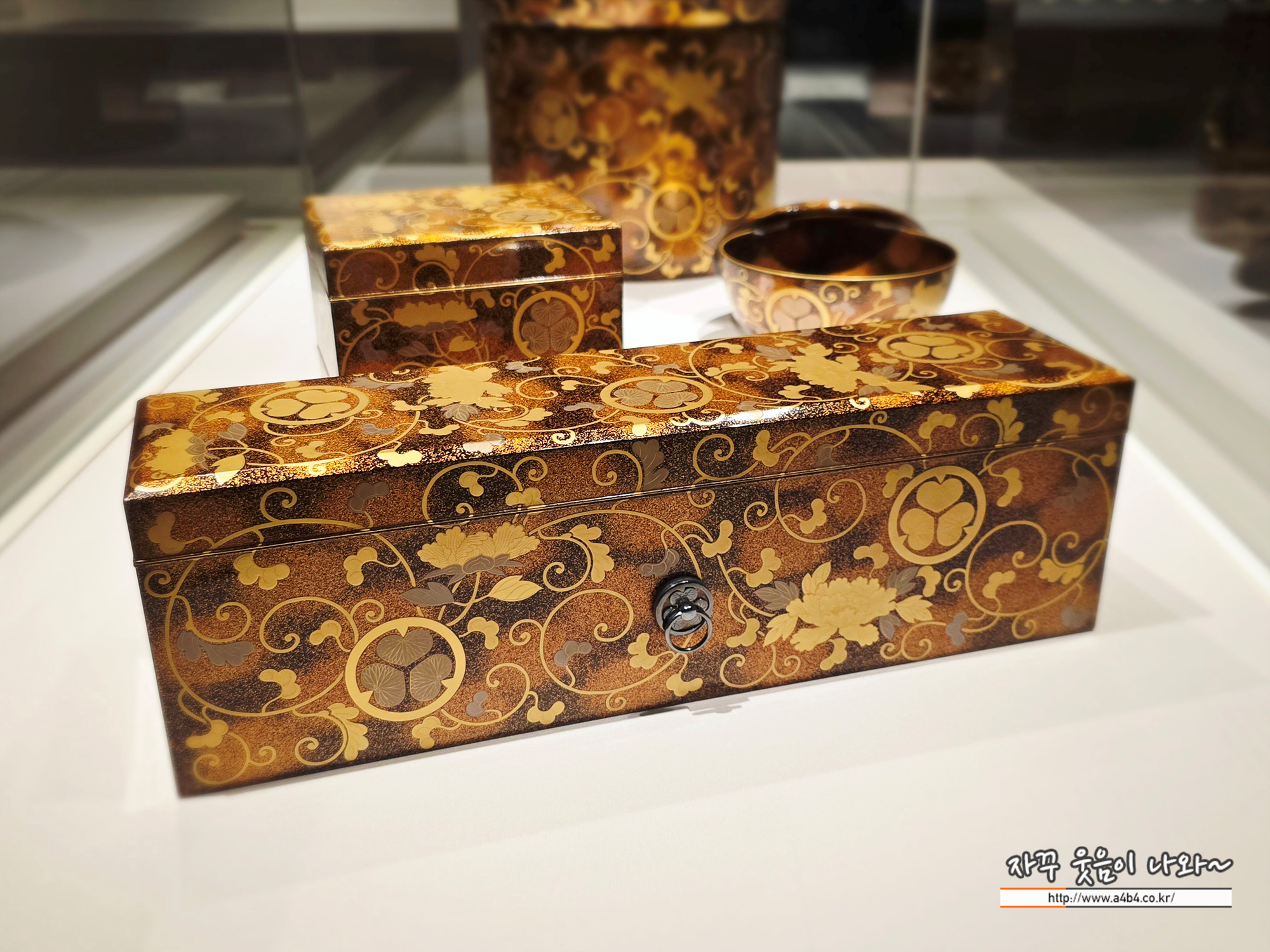 한편, 이 시기 상류층 무가(武家) 사회에서 혼례 의식과 혼수품은 가문의 위세와 품격을 드러내는 중요한 수단이었습니다. 이 도구 역시 검은 칠 바탕에 금은 가루를 뿌려 장식하는 마키에 기법으로 화려하게 꾸몄습니다. 금은 가루를 배경에 흩뿌린 뒤, 그 위에 모란넝쿨무늬와 도쿠가와 가문의 문장(葵紋), 그리고 접시꽃무늬를 군데군데 배치해 한층 더 화려함을 살렸습니다. 이처럼 꾸밈은 때때로 권위를 드러내는 방식으로도 사용되었습니다