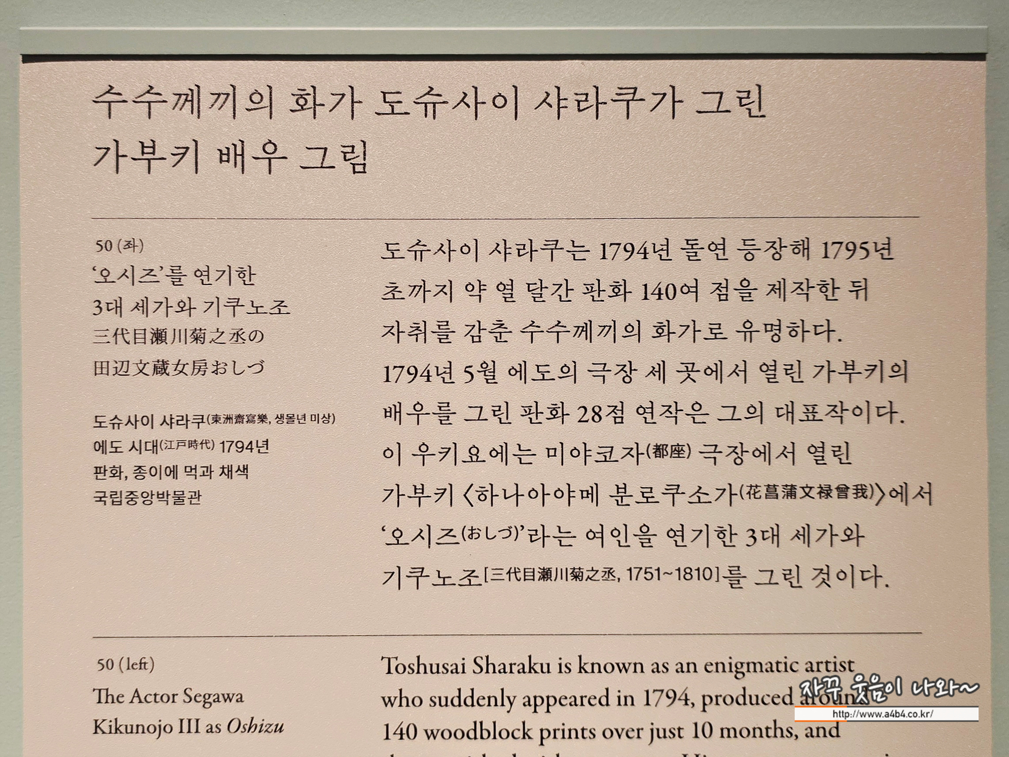 1794년부터 1795년 초까지 약 열 달간 판화 140여 점을 제작한 뒤 자취를 감춘, 수수께끼의 화가로 잘 알려져 있습니다. 1794년 5월 에도(현재의 도쿄) 내 세 극장에서 열린 가부키(歌舞伎)에 출연한 배우들을 묘사한 판화 28점 연작은 그의 대표작으로 평가됩니다.