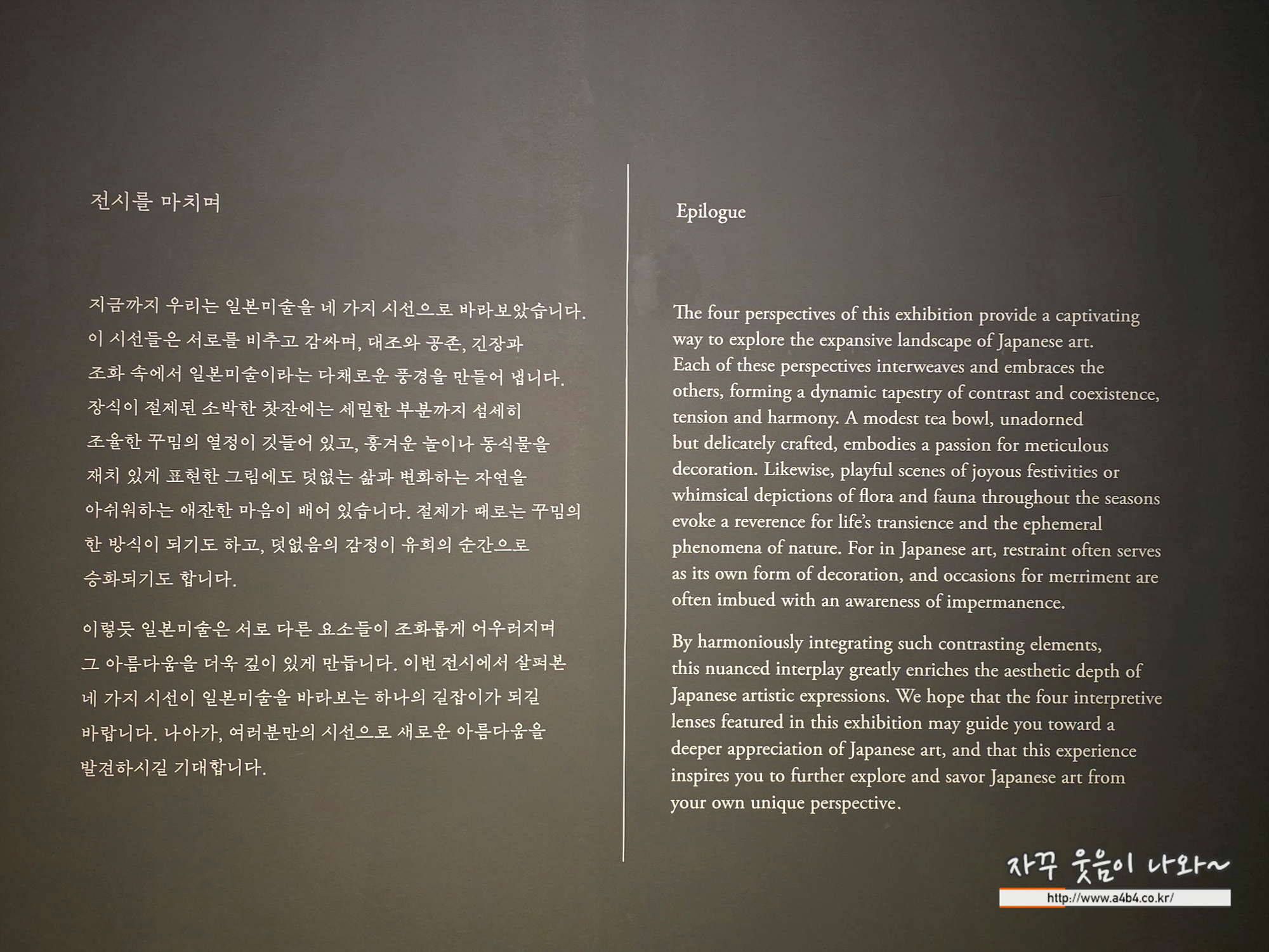 지금 생각해보니 지금까지 관람했던 전시회 중에서 일본 작가의 전시회 또는 일본 미술전시회를 접했던 경험이 몇 손가락에 뽑는 것 같네요. 이번 전시회가 잘 알고 있는 것 같지만 잘 모르는 일본 전통미술에 대한 이해가 되는 좋은 기회로 추천 합니다.