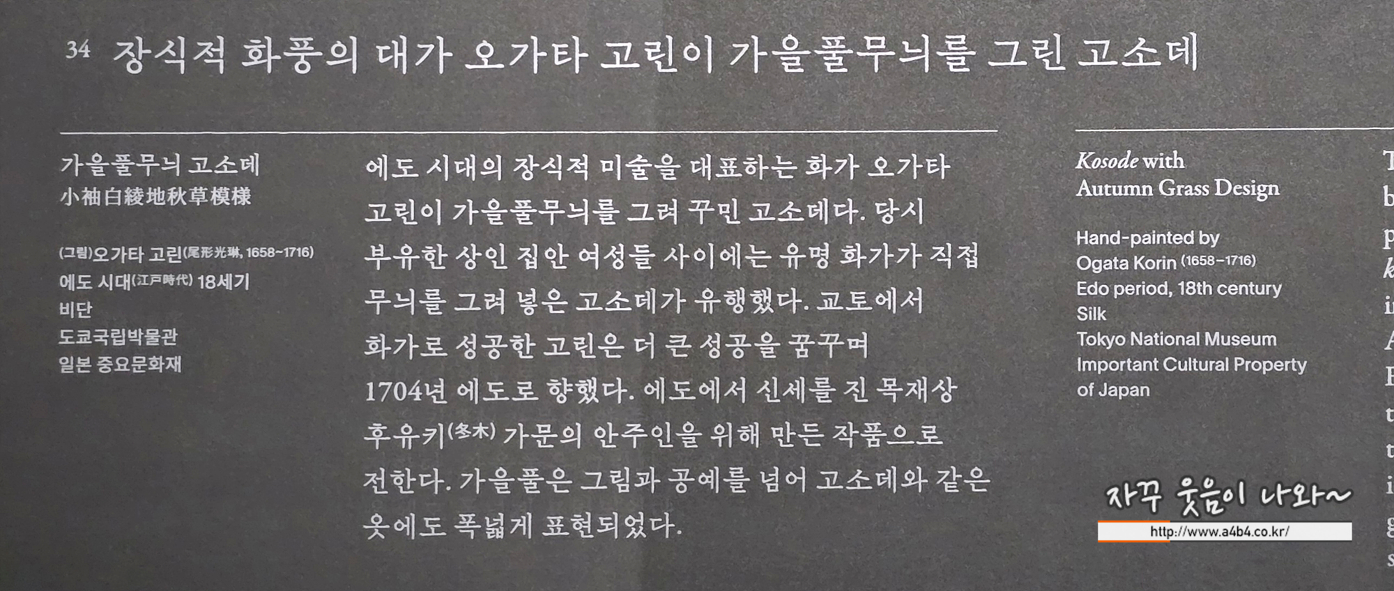 에도 시대(江戸時代, 1603-1868) 전기부터 중기까지 활약한 화가 오가타 고린(尾形光琳, 1658-1716)께서 직접 무늬를 그린 것으로 알려진 고소데(小袖)입니다. 이 옷과 함께 전해 오는 두루마리 그림을 통해 오가타 고린의 작품임을 확인할 수 있습니다.