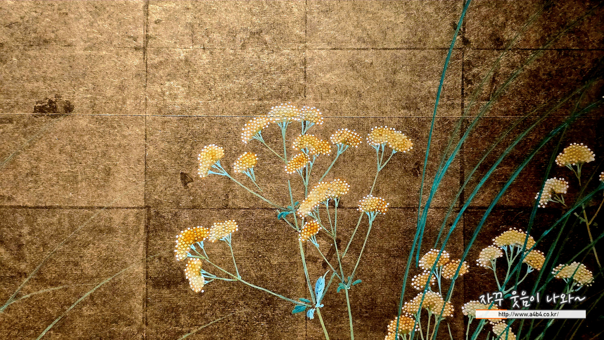 마타리꽃에 대한 표현, 사진에서는 잘 못 느끼겠지만 노란 금박 배경위에 금보다 더 노란 꽃들의 표현이 상당히 흡입력을 가진다.
