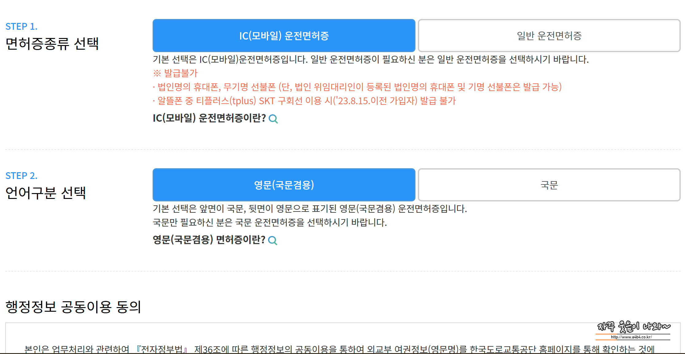 해당 스탭에서는 IC 모바일 운전면허증 or 일반운전면허증 선택