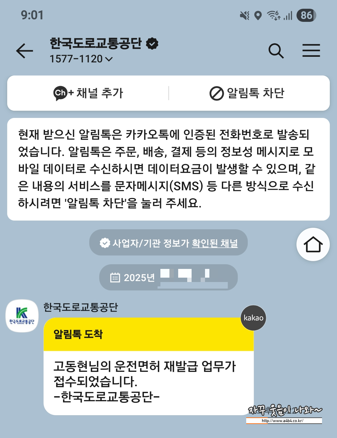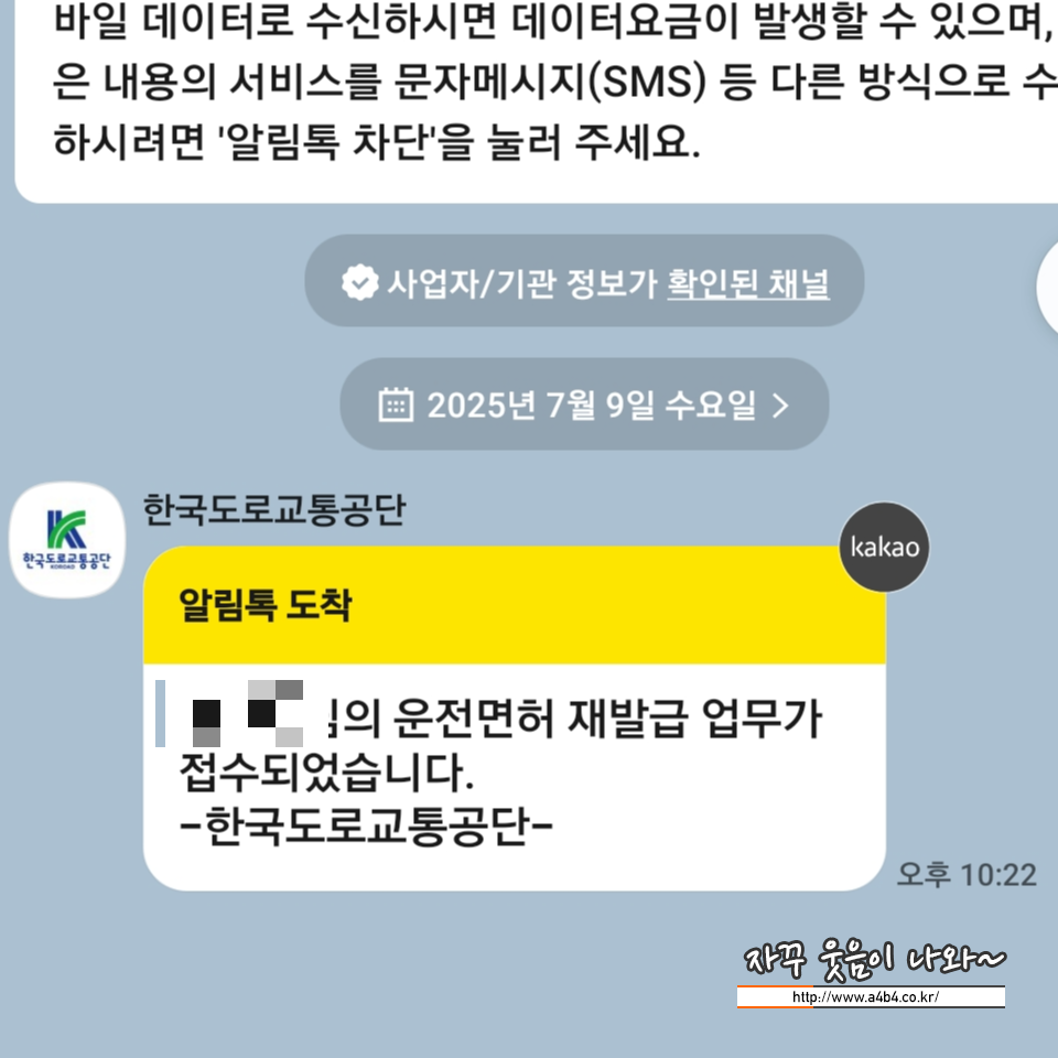 결제가 완료되면 카카오알림톡으로 인터넷 운전면허증 분실 재발급 신청완료 문자가 옵니다.
