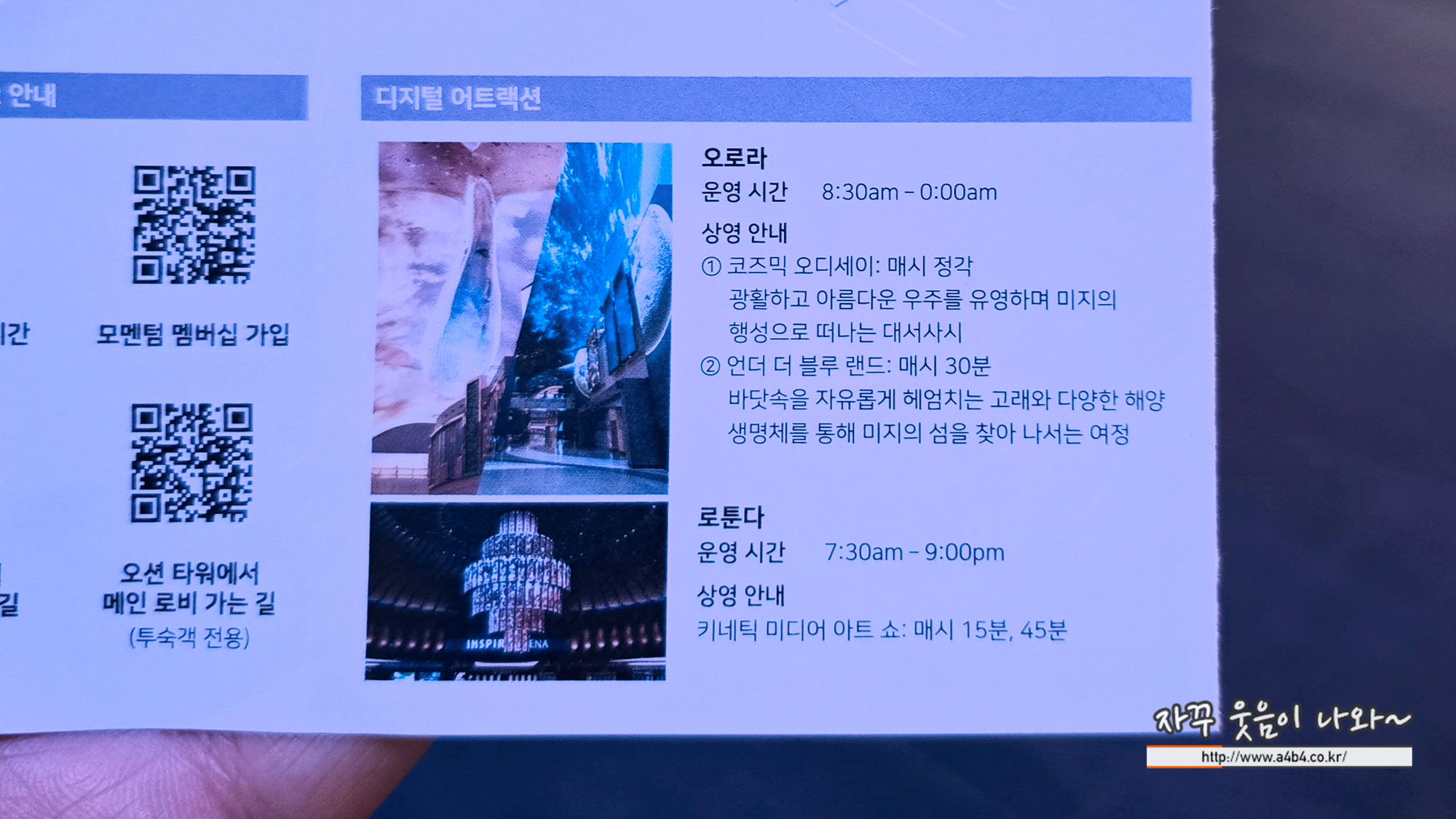 인스파이어리조트 로툰다 상영시간은 아래 안내책자에 오전 07:30 부터 21시까지 운영되며 매시 15분과 45분 키네틱 미디어 아트쇼가 열린다고 안대되어 있어 시간 맞춰 방문했지만...