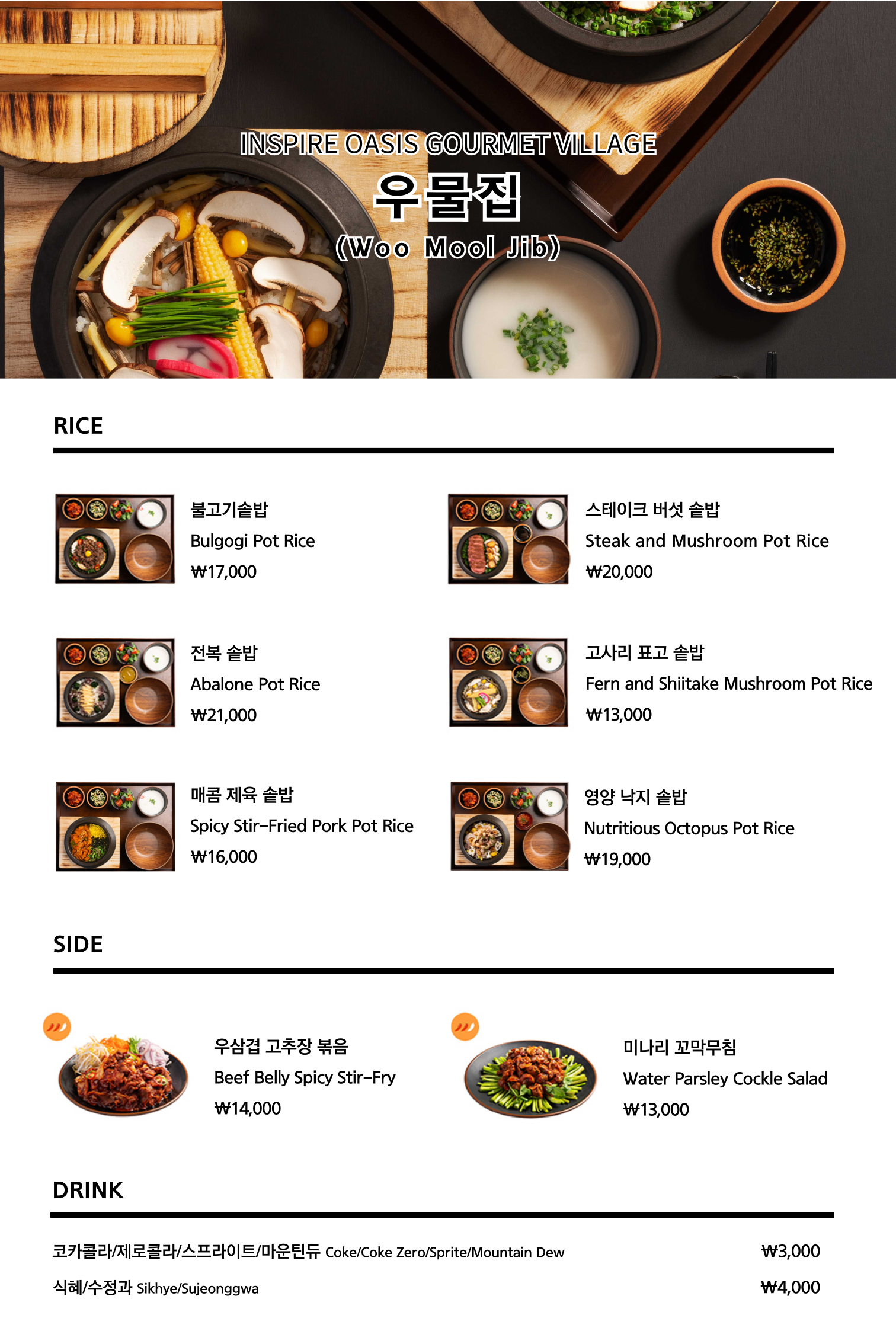 오아시스 고메빌리지 메뉴 및 가격은 아래 메뉴판 참고하세요.