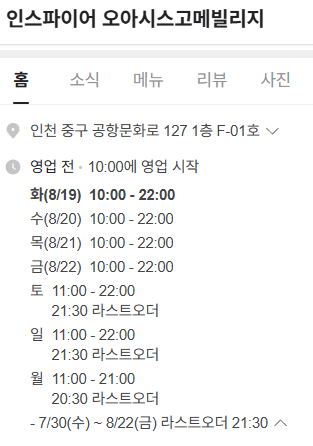 인스파이어리조트 푸드코트 오아시스 고메빌리지 영업시간은 블로그 홈페이지에 안내된 시간이 모두 상이합니다. 네이버에는 평일 10:00~22:00 (라스트오더 20:00) 주말 11:00~22:00 (라스트오더 21:00) 로 홈페이지에는 평이 11시부터 영업시작으로 각각 다른 정보로 안내하고 있네요.
