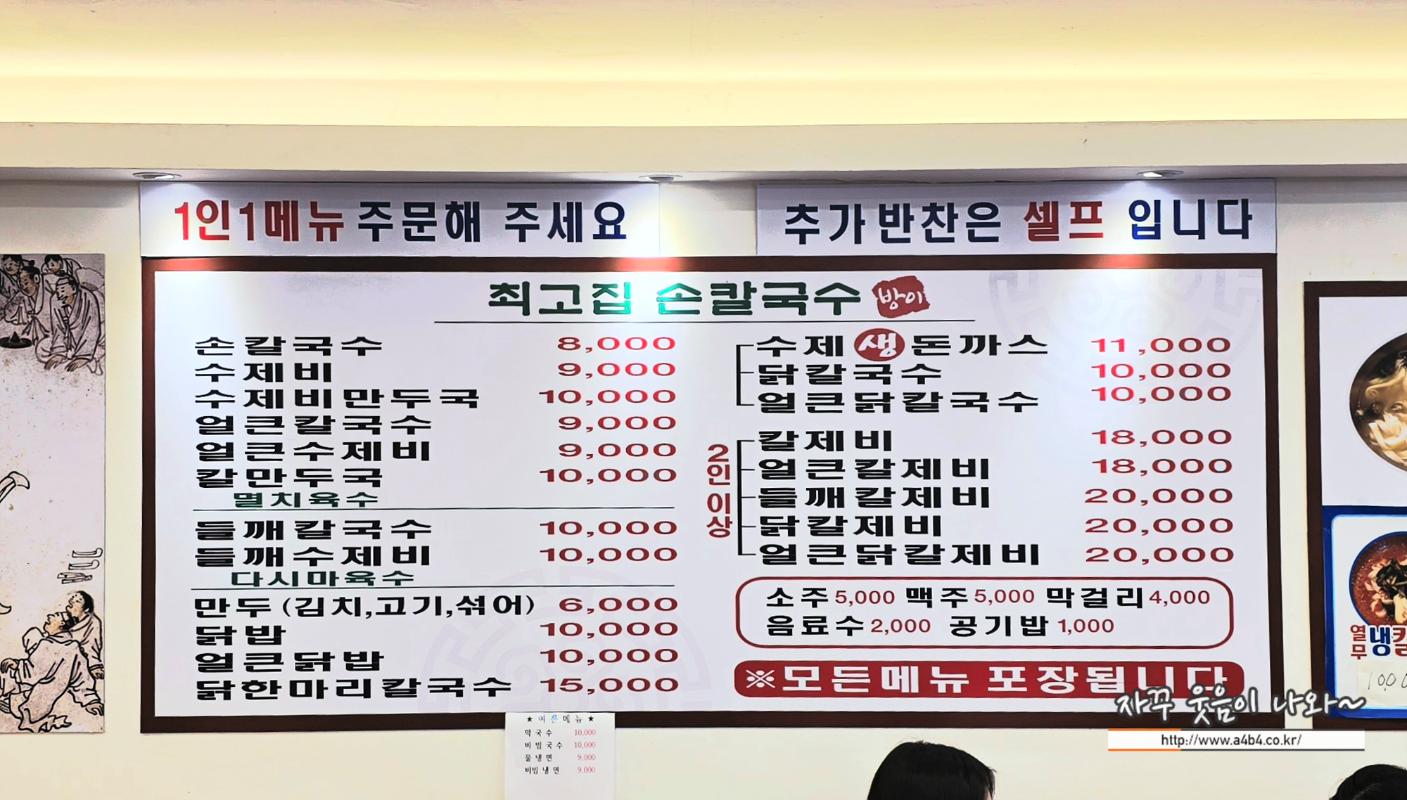 메인 메뉴는 칼국수와 수제비고요. 여기에 얼큰칼국수, 들깨칼국수, 닭칼국수 등 다양한 칼국수가 준비되어 있습니다. 이외에 돈까스, 만두, 콩국수 등의 메뉴도 맛볼 수 있습니다. 가격은 1만원 전후...