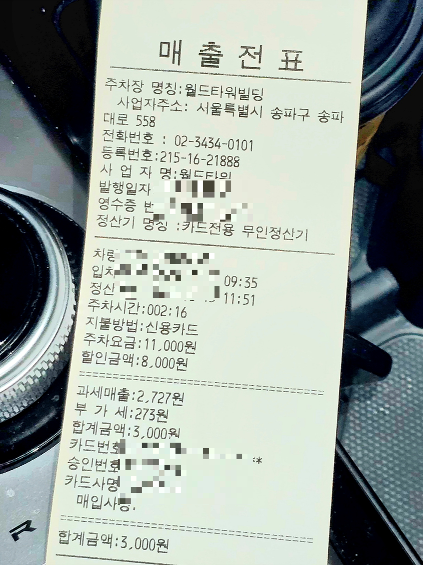 잠실월드타워 주차장 주차요금은 10분에 1,000원 입니다. 최초 30분 무료 이후 주차요금 부과됩니다. 잠실퍼스트정형외과의원 방문객은 90분 추가 무료주차가 지원되는데요. 저는 140분 주차하고 추가 주차요금 3,000원 나왔네요.