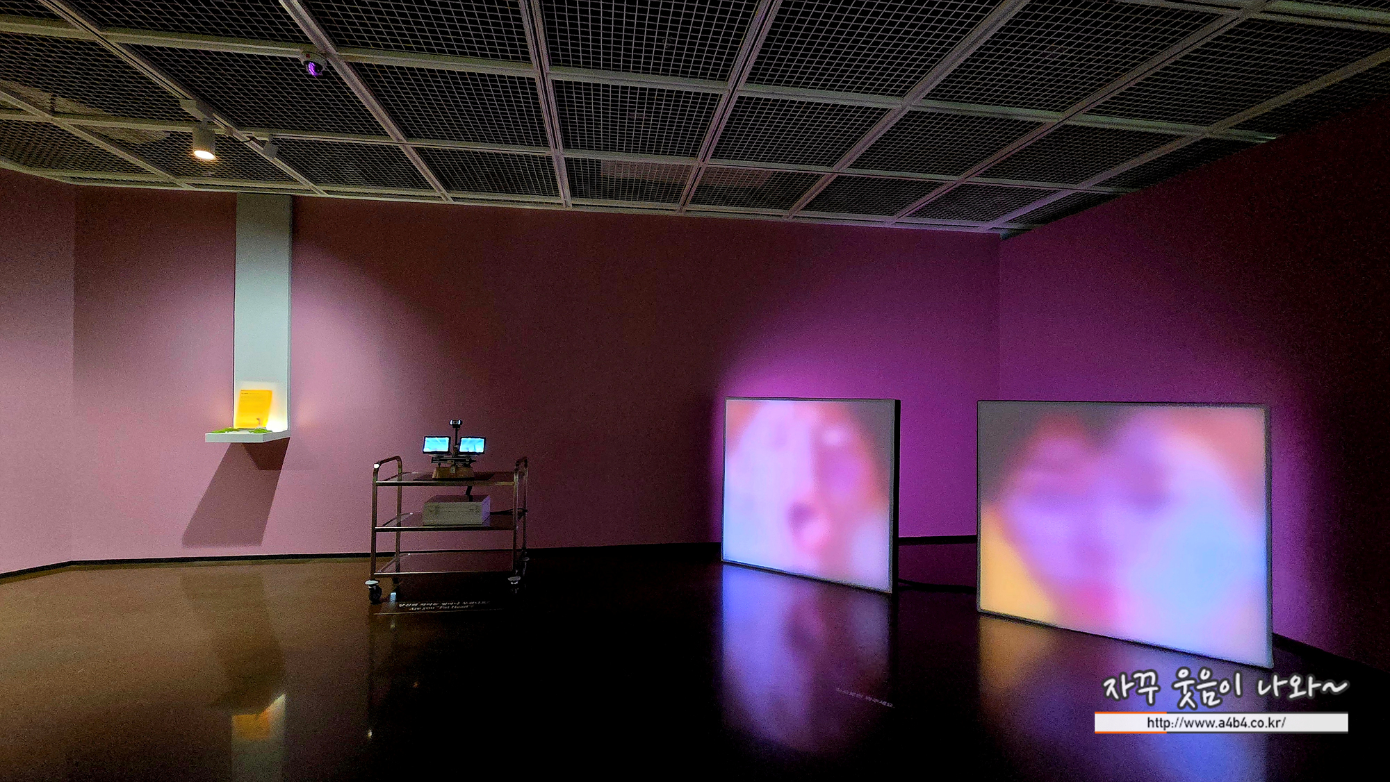 다양한 인물의 이미지가 끊임없이 순환하며 의도를 명확히 파악하기 어려운 소리가 울려 퍼집니다. 영상은 표면의 막에 의해 흩어져 불분명하게 보이며, 웃는 형상처럼 보이더라도 원본 이미지는 우리의 상상과 달리 눈물을 흘리고 있을 수도 있습니다. 이를 통해 작가는 기술 발전에 따른 인간의 가치 판단의 문제에 대해 질문을 던집니다.