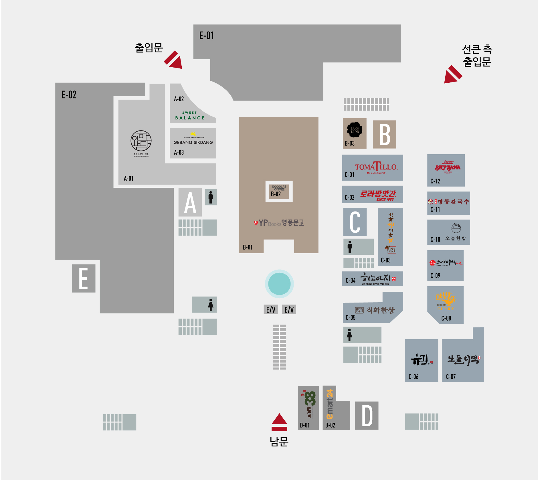 포스코센터 지하 1층 배치도 및 입점업체는 서점(영풍문고), 편의점(이마트24), 커피전문점(만랩, 타르타르) 지하 식당가(The Blvd. 440), 포스코 미술관 등 이 위치해 있습니다.