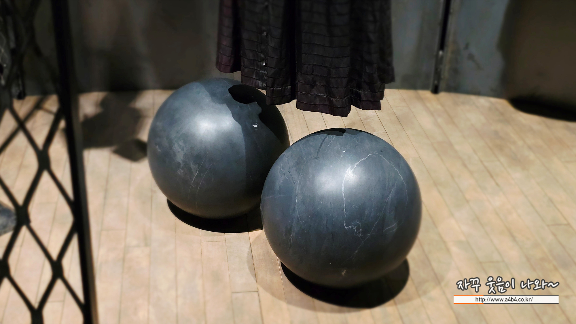한 쌍의 구는 가슴을 연상시키기도 하고 위에 걸린 드레스와 시각적으로 연결되며 남근적인 형상을 만들어 내기도 합니다.