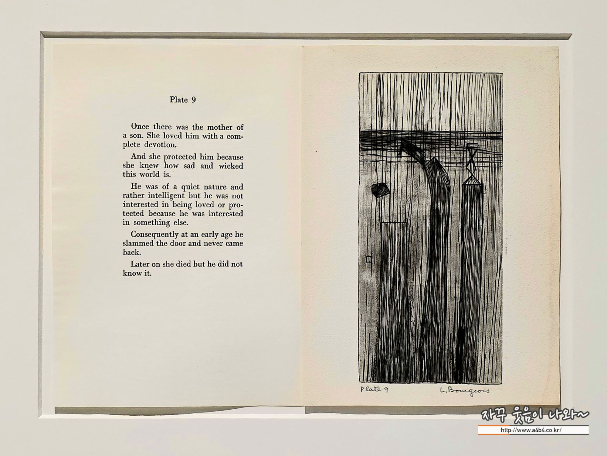 이 형상들은 부분적으로는 그가 사랑했던 뉴욕과 그곳의 건축에서 비롯되었지만, 함께 실린 글은 작품을 익숙한 풍경 너머로 이끌어 갑니다. 동화 같은 어조로 짧고 간결하게 서술된 이야기들은 때로는 충격적이고, 때로는 우스꽝스럽거나 비극적으로 다가옵니다. 브루주아는 이렇게 썼습니다.