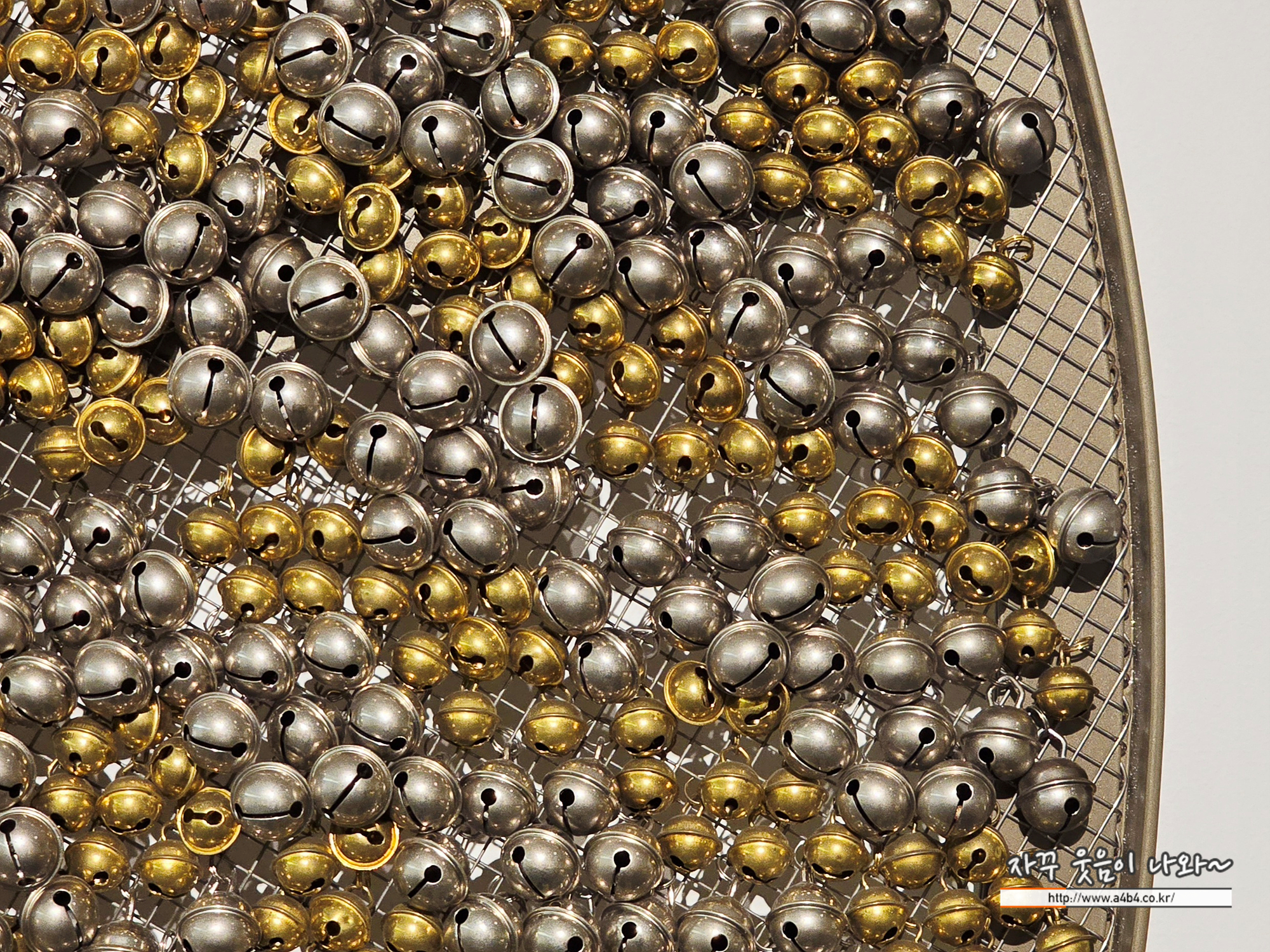 Brass Plated #28, 2014, steel sheet, powder coating, ball bearings, metal grid, brass plated bells, nickel plated bells, metal rings, 100x78x7cm