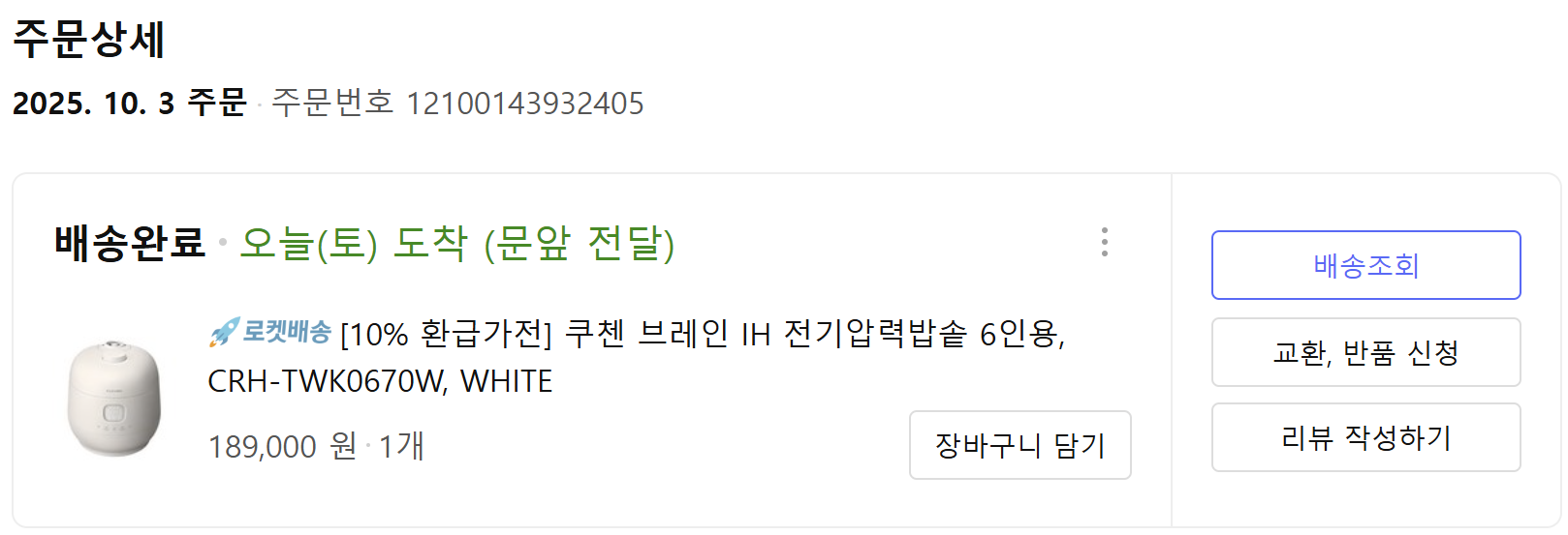 189,000원 결제하고 10% 환급신청해서 18,900원 환급 받으니 실 구매가는 17,100원이네요. 시중에서 판매하는 쿠첸 브레인 IH 압력밥솥 CRH-TWK0670W 가격이 20만원 초반으로 상대적으로 프로모션 통해 저렴하게 구입 했네요.