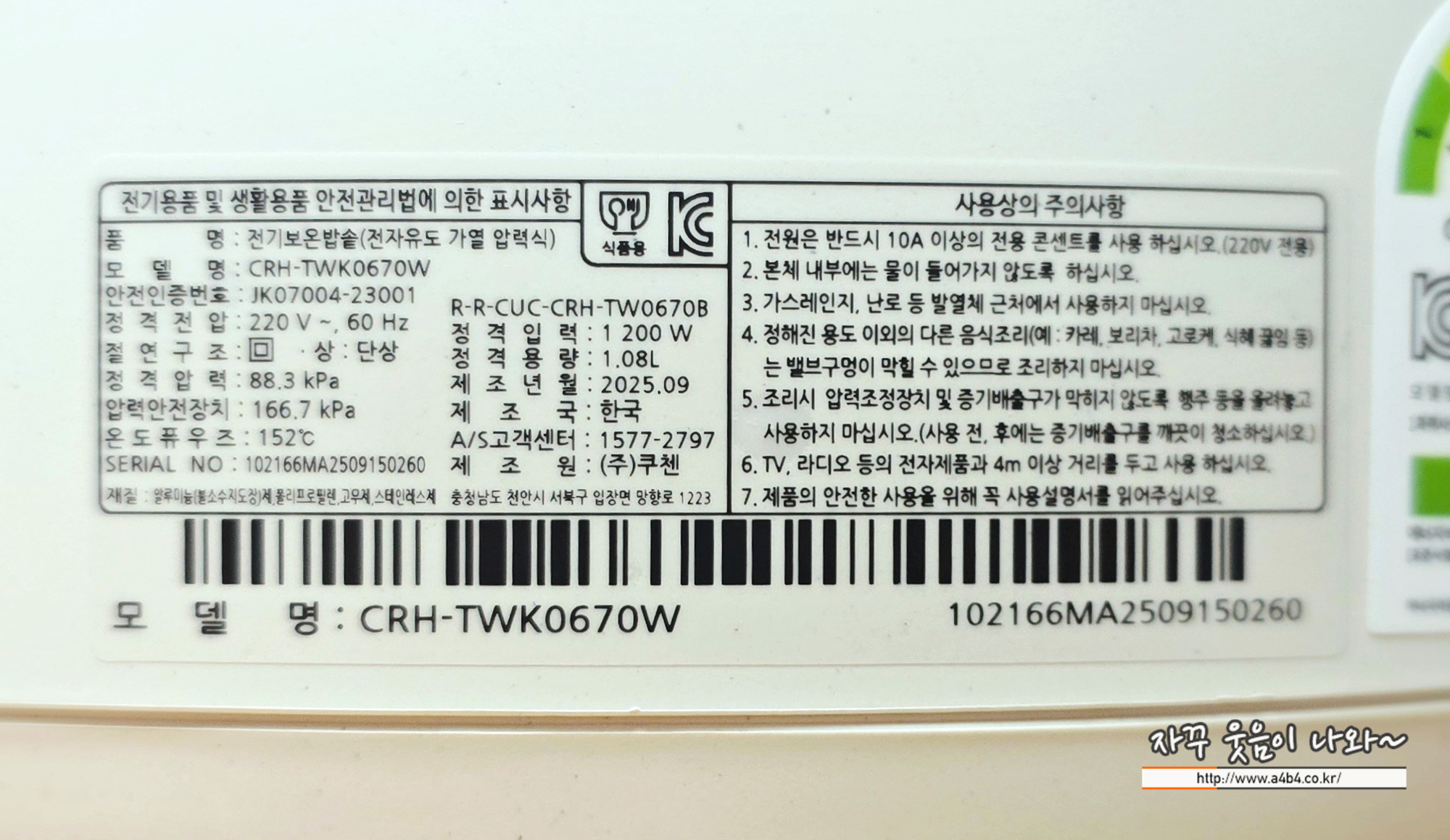 쿠첸 6인용 ih 압력밥솥 가성비 모델 : CRH-TWK0670W