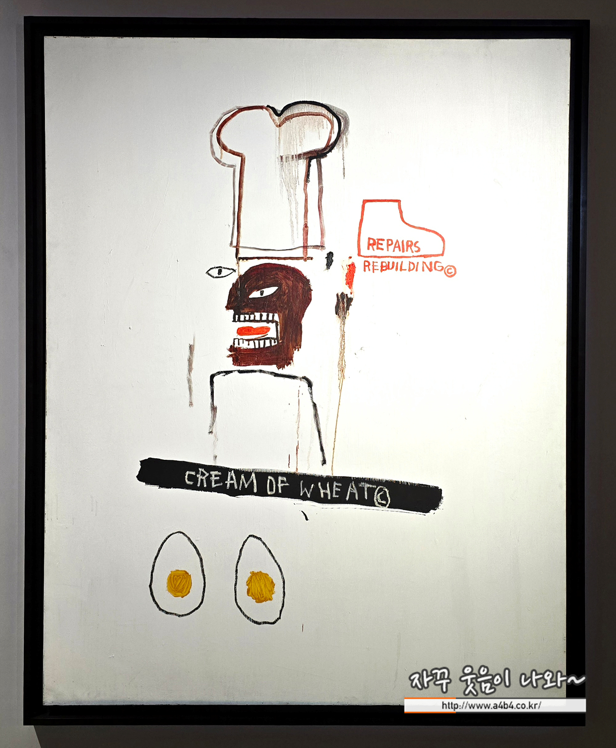 바스키아는 이 이미지를 완전히 전복한다. 시리얼 그릇을 신발로 바꾸고, ‘REPAIRS’, ‘REBUILDING©’ 등 단어를 넣어 재건·수정 메시지를 전달한다. 분리된 눈, 불꽃 같은 혀, 반복된 저작권 기호는 흑인의 몸과 이미지가 쉽게 소유·거래되는 현실을 비판한다.