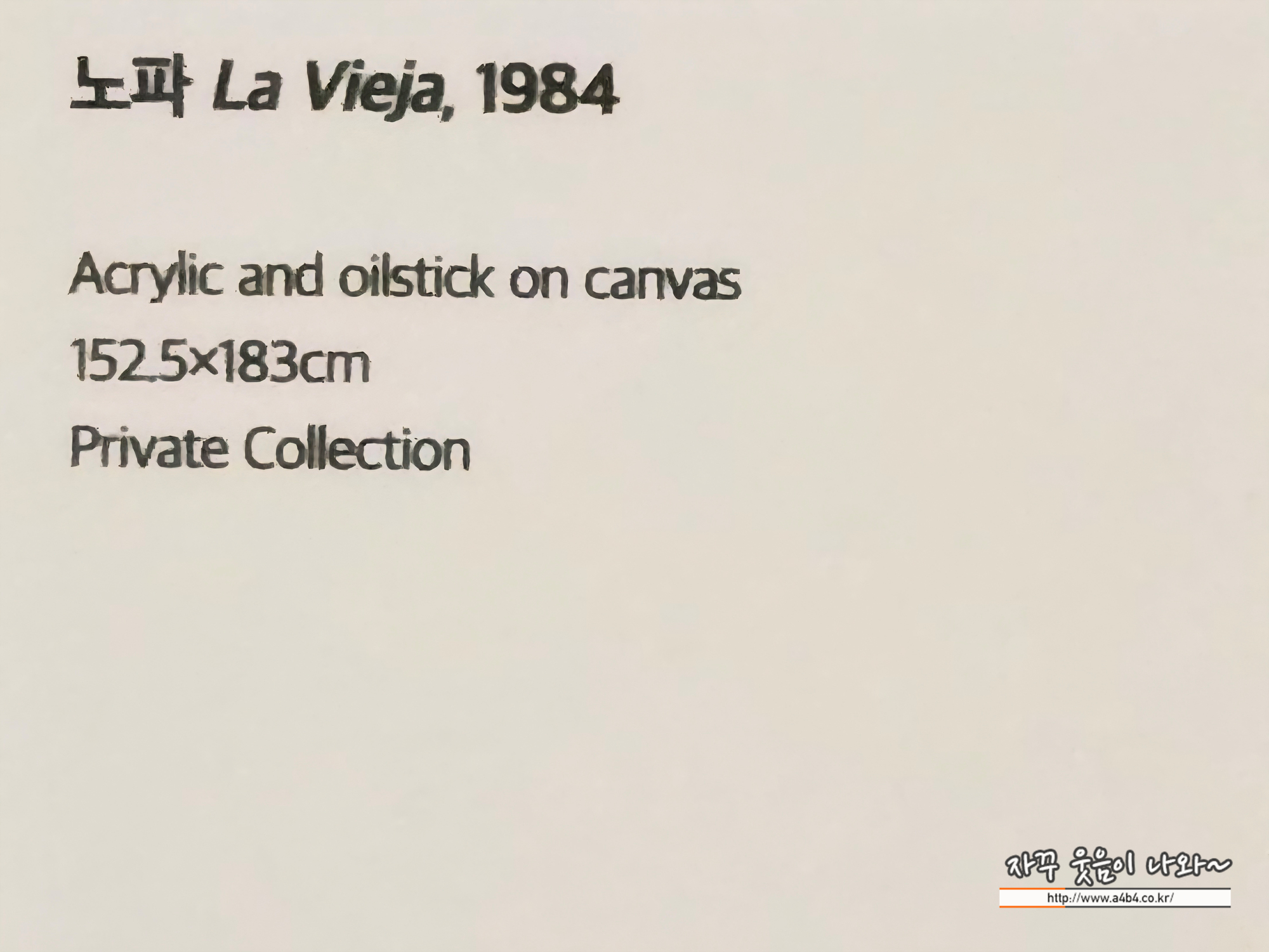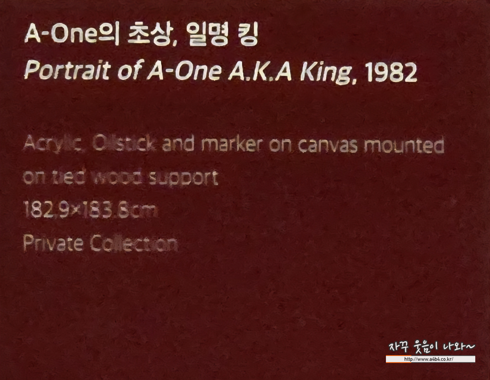 이 작품은 1982년에 장 미셸 바스키아가 그린 A-One A.K.A. King이다. 그는 친구이자 전설적인 그래피티 아티스트인 A-One을 거리의 왕으로 기념했다. 그래피티 세계에서 ‘King’은 실력 있는 작가에게 붙는 칭호인데, 바스키아는 여기에 자신의 왕관 상징을 더해 고전 미술의 왕 초상화 전통과 거리 문화를 연결했다.