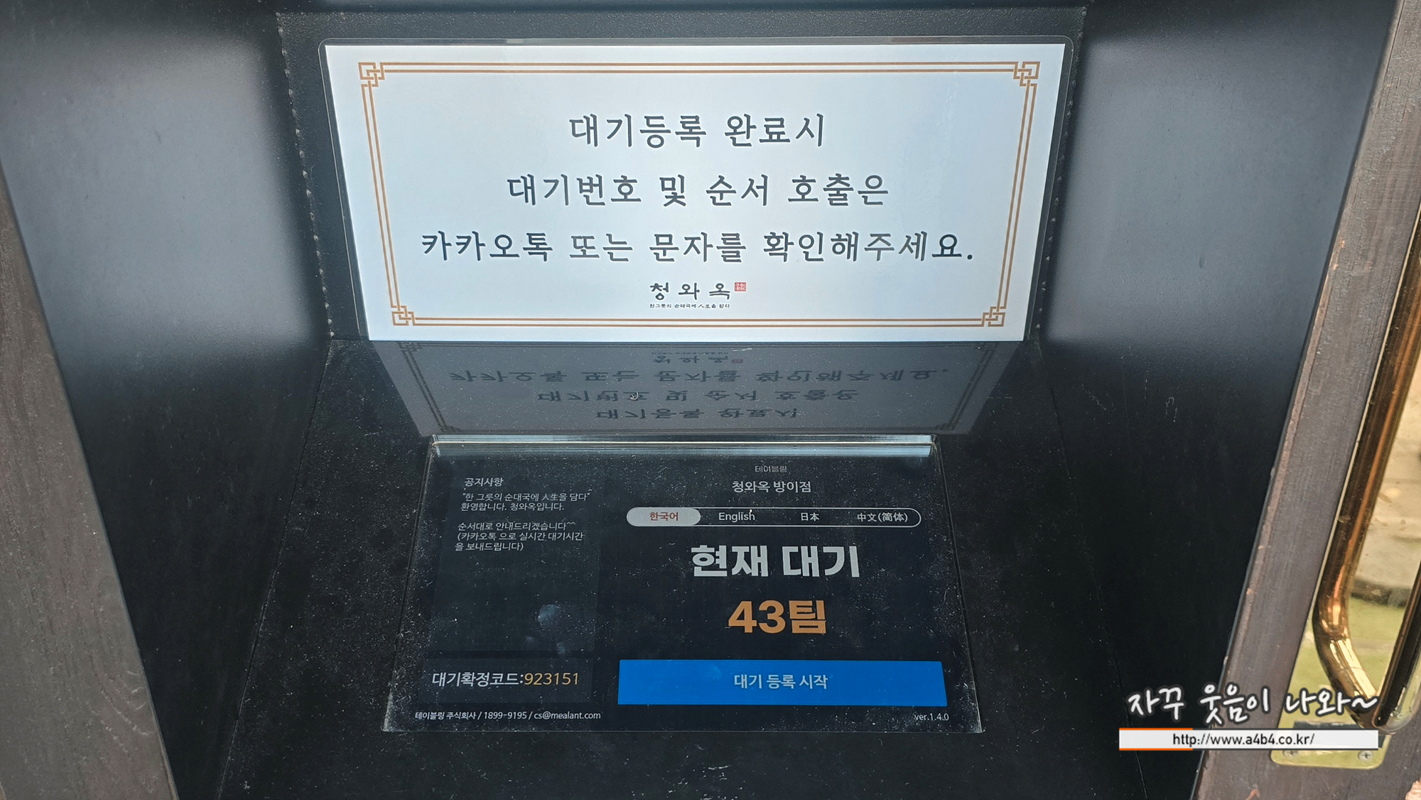 잠실 청와옥 웨이팅은 매장 앞 테블릿에서 휴대전화 번호 입력하고 대기하시면 되는데요. 제가 방문한 시간은 식사시간이 지났는데도, 43팀이 웨이팅 상태입니다. 이 정도면 90분 이상 대기해야 하는 상황입니다.