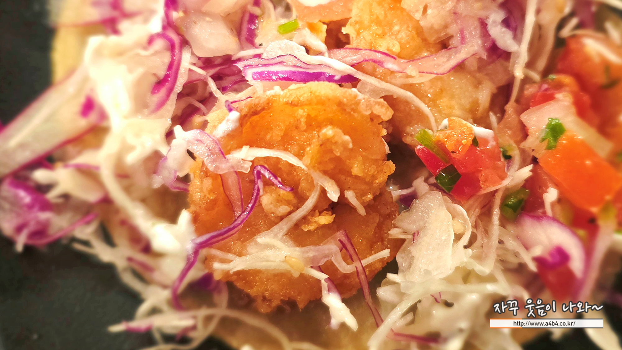 바토스 또띠아, 튀긴 통새우, 치폴레 마요, 양배추, 참깨 드레싱, 피코 데 가요, 라임 고수 사워크림이 들어간 잠실 멕시코요리 전문점 바토스 칠리라인 쉬림프 타코