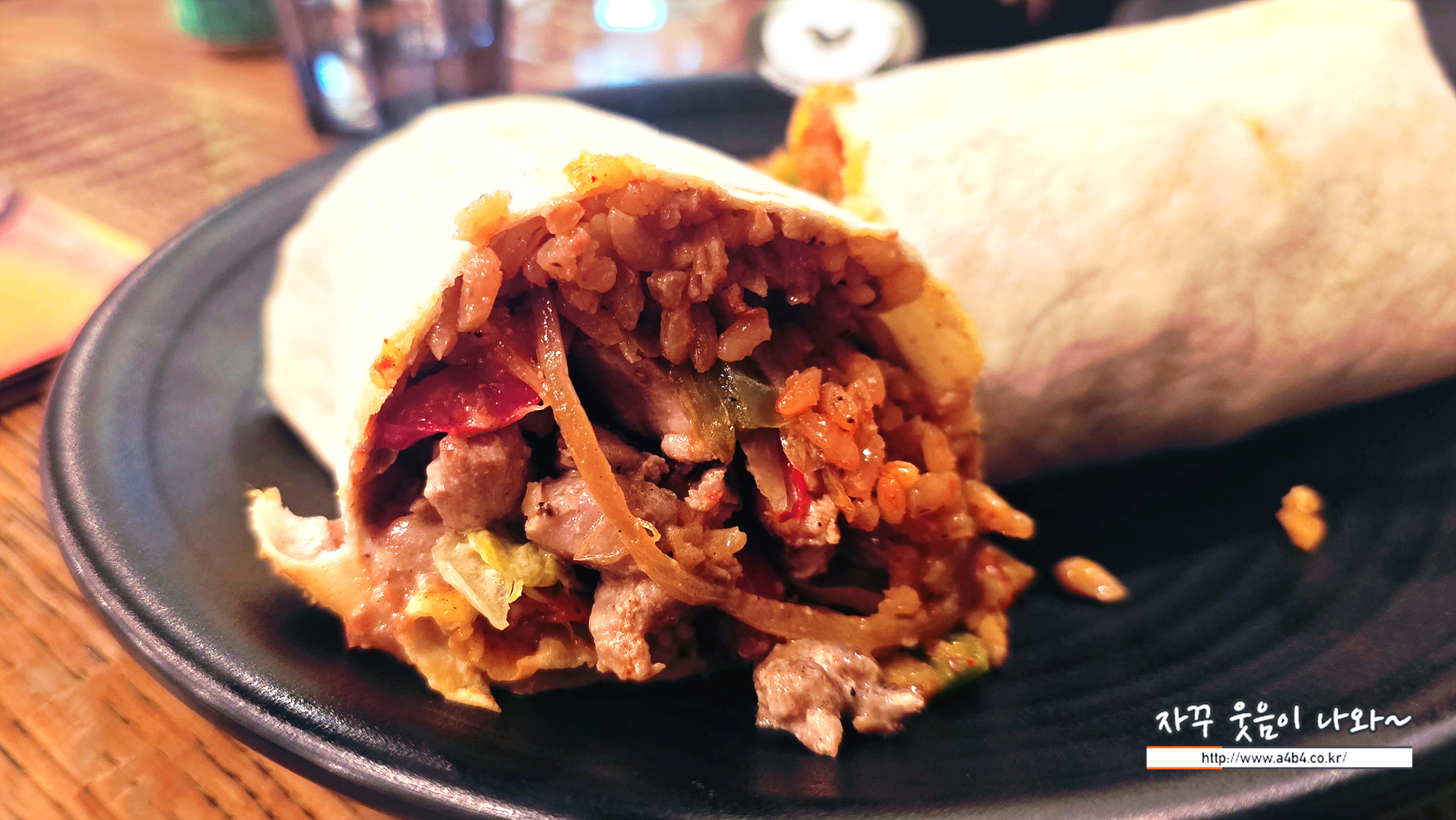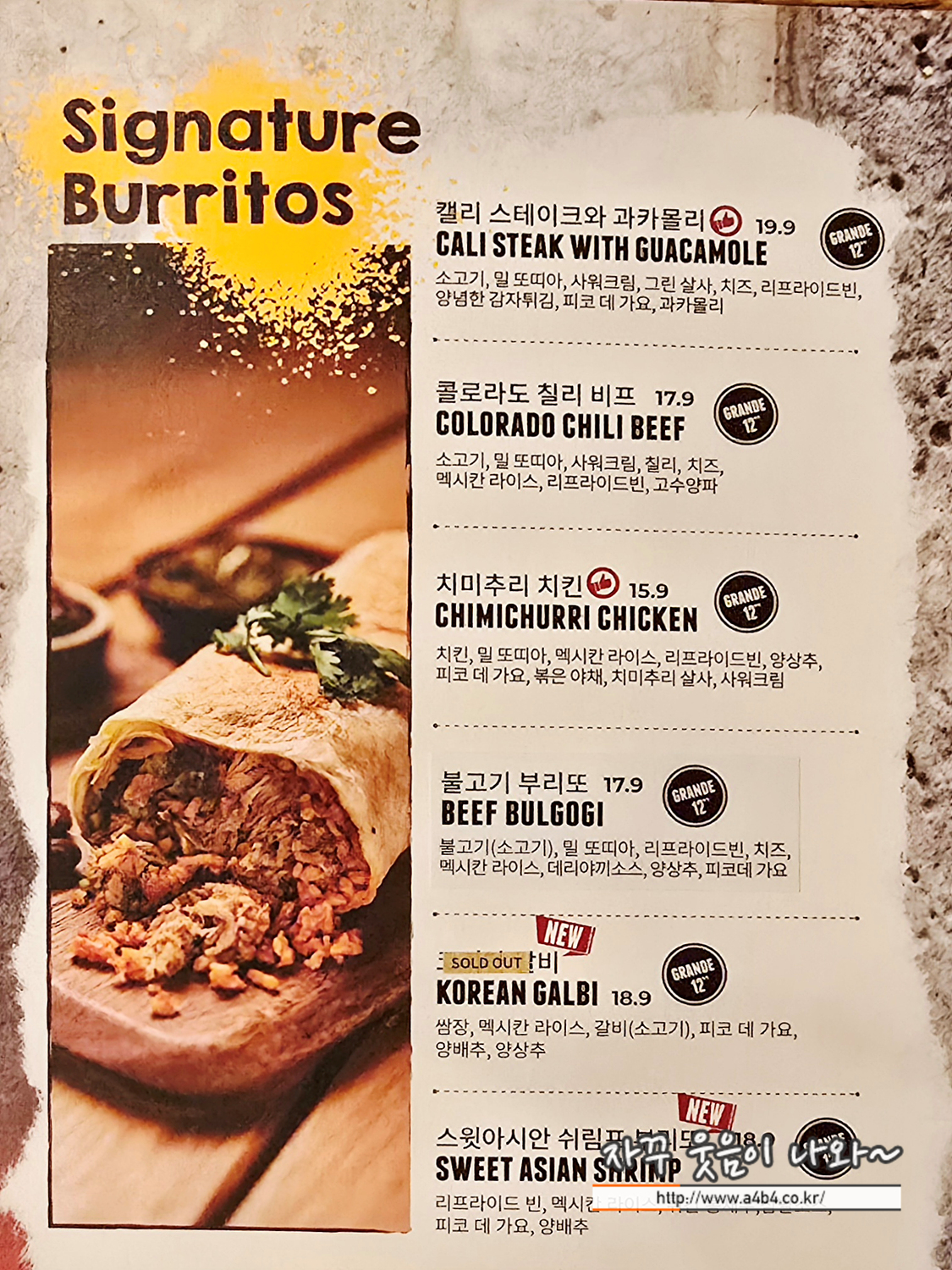 스윗아시안 쉬림프 부리또, 코리안 갈비, 캘리 스테이크와 과카몰리, 콜로라도 칠리 비프, 치미추리 치킨, 김치 까르니따스, 불고기 부리또가 준비되어 있습니다.