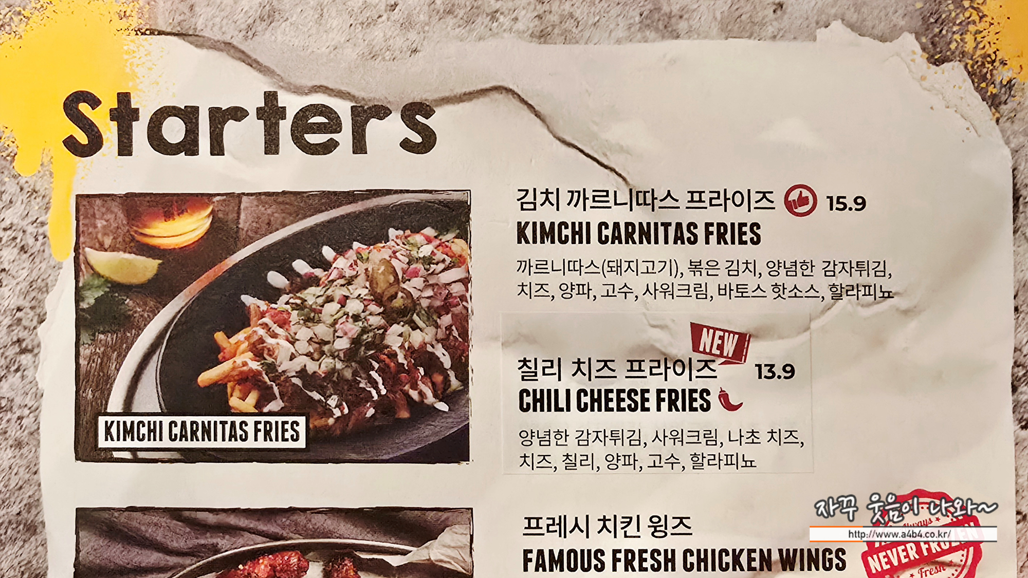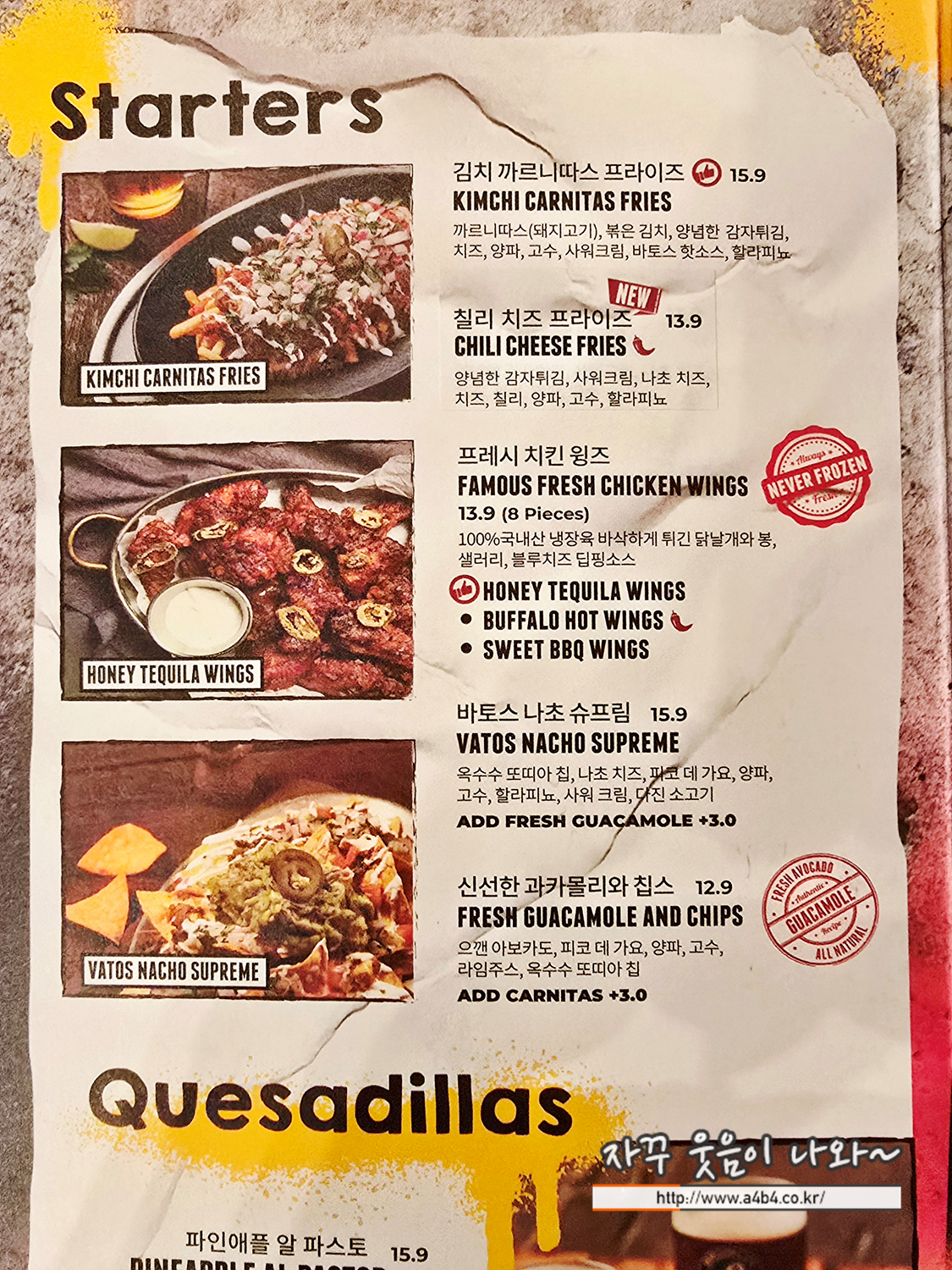 칠리 치즈 프라이즈, 바토스 나초 슈프림, 프레시 치킨 윙즈, 김치 까르니따스 프라이즈, 신선한 과카몰리와 칩스가 준비되어 있고요.
