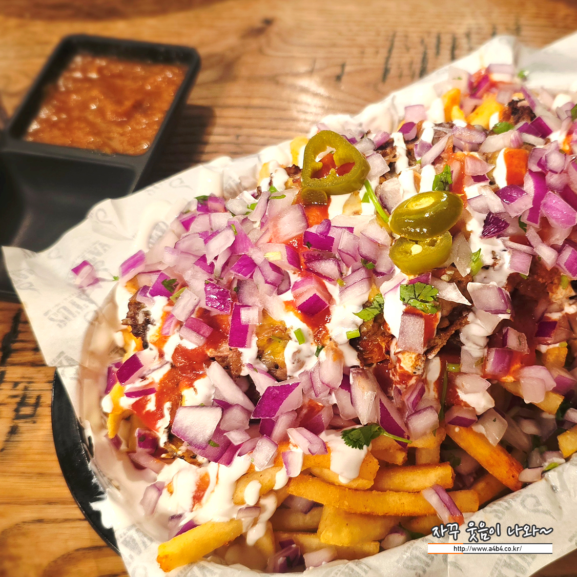 CARNITAS는 맥시코식 돼지고기 요리인데요. 아래에는 감자튀김과 위에는 까르니타스와 양파가 올려 있습니다.