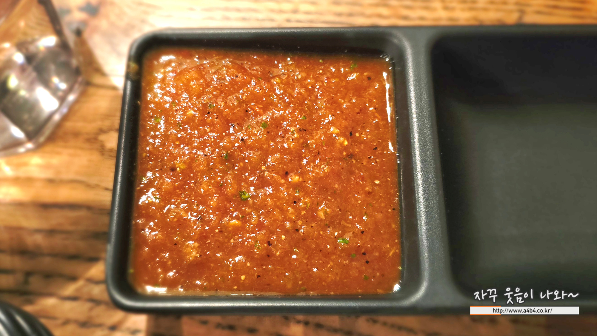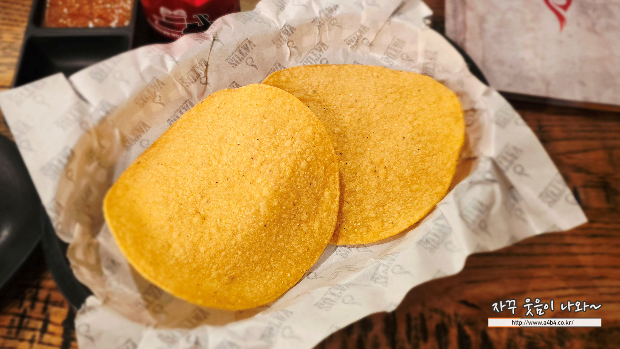 먼저 손바닥 크기의 또띠아 칩과 소스가 나오네요.