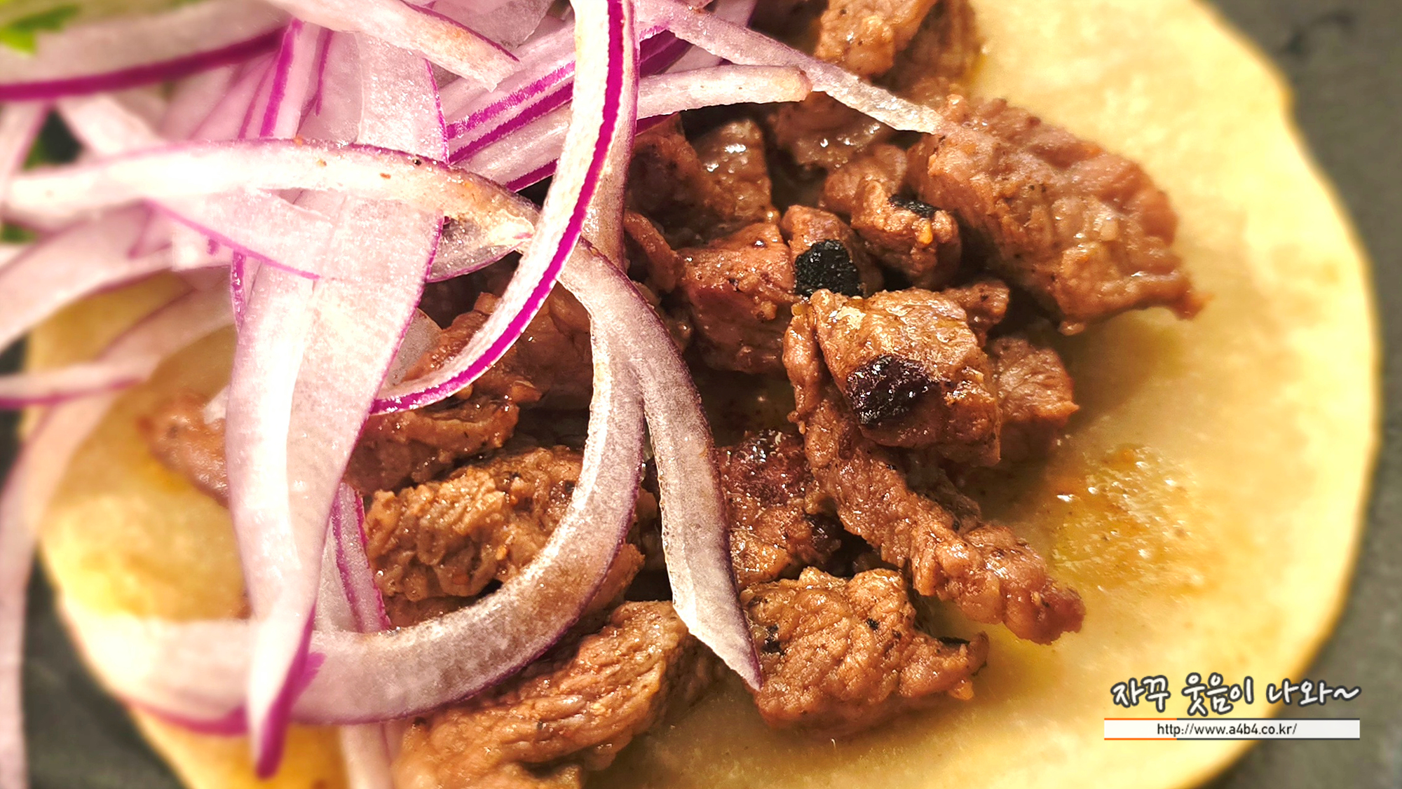 바토스 또띠아, 까르네 아사다(소고기), 양파, 고수, 딱 한 입에 먹기 좋은...