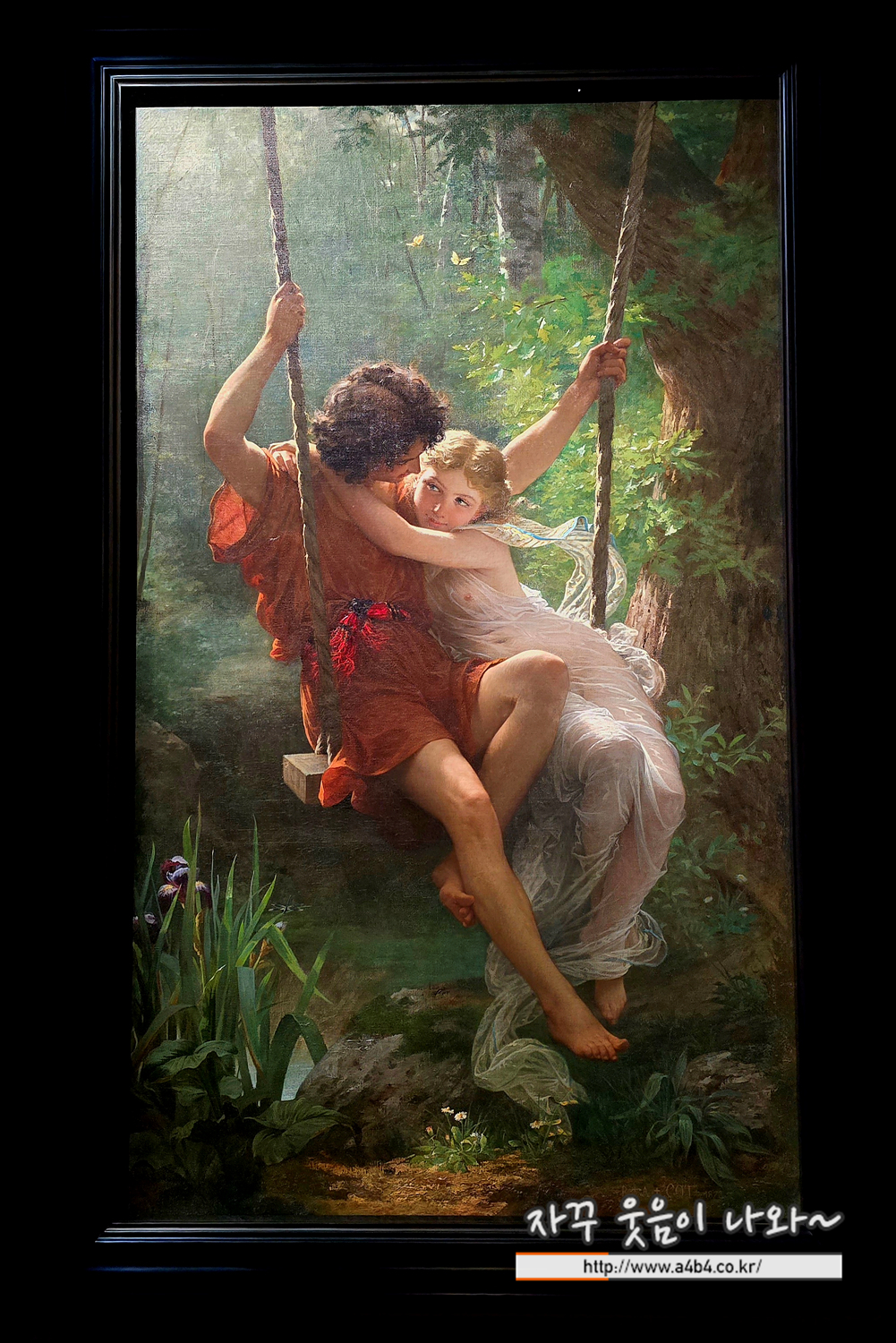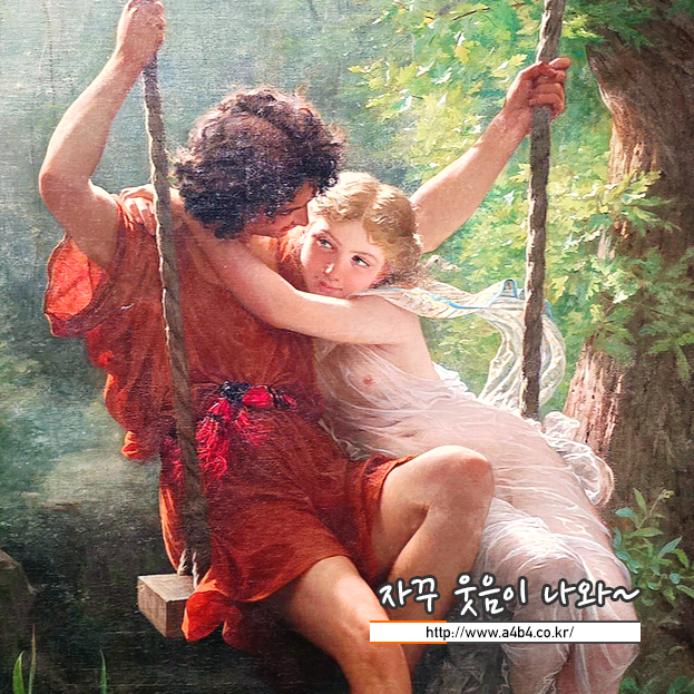 고대 신화 속 주인공 같은 젊은 연인이 서로를 다정하게 끌어안고 그네를 타고 있습니다.