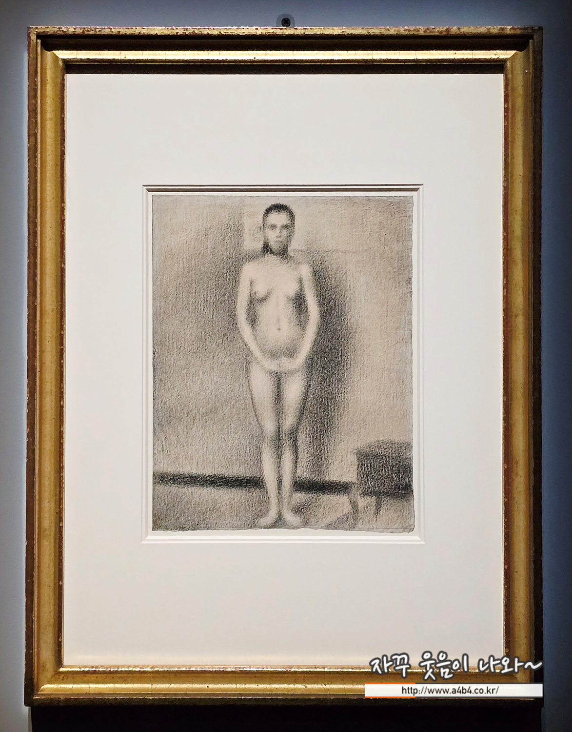 선명한 선 대신 은은한 빛으로 표현된 몸은 신비롭게 빛나는 듯합니다. 쇠라는 밝은색을 작은 점으로 찍는 ‘점묘법’으로 잘 알려져 있지만, 질감 있는 종이에 검은 콩테 크레용으로 그린 드로잉에서도 매혹적인 표현력을 보여줍니다.