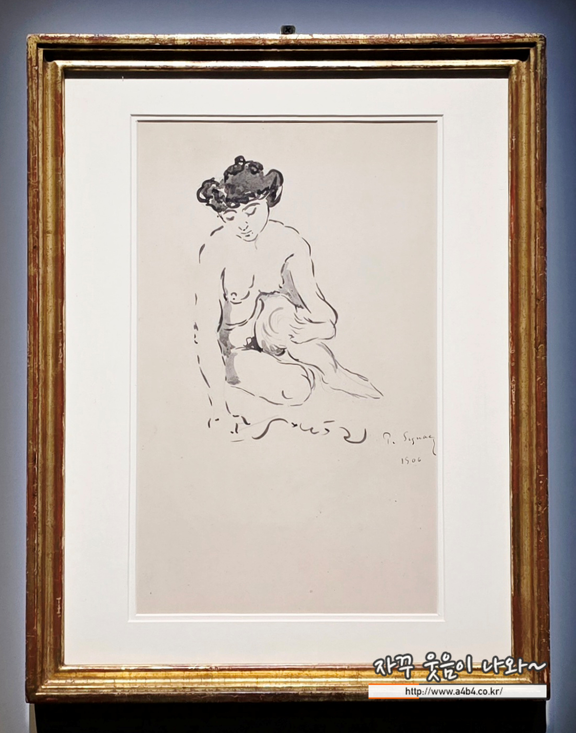 화가 폴 시냐크가 수집한 250여 점의 작품에는 조르주 쇠라, 앙리 마티스 등이 그린 누드화가 포함돼 있어 그의 누드 표현에 대한 관심을 알 수 있다. 이 작품은 시냐크의 그림 중 매우 드문 누드 드로잉이다. 가벼운 연필 선 위에 굵은 선으로 덧칠한 여성의 모습에서 가장 눈에 띄는 부분은 위로 틀어 올린 머리로, 어두운색으로 강조했다. 여성의 자세와 몸의 윤곽 표현 방식에서 마티스 누드화의 영향이 드러난다.