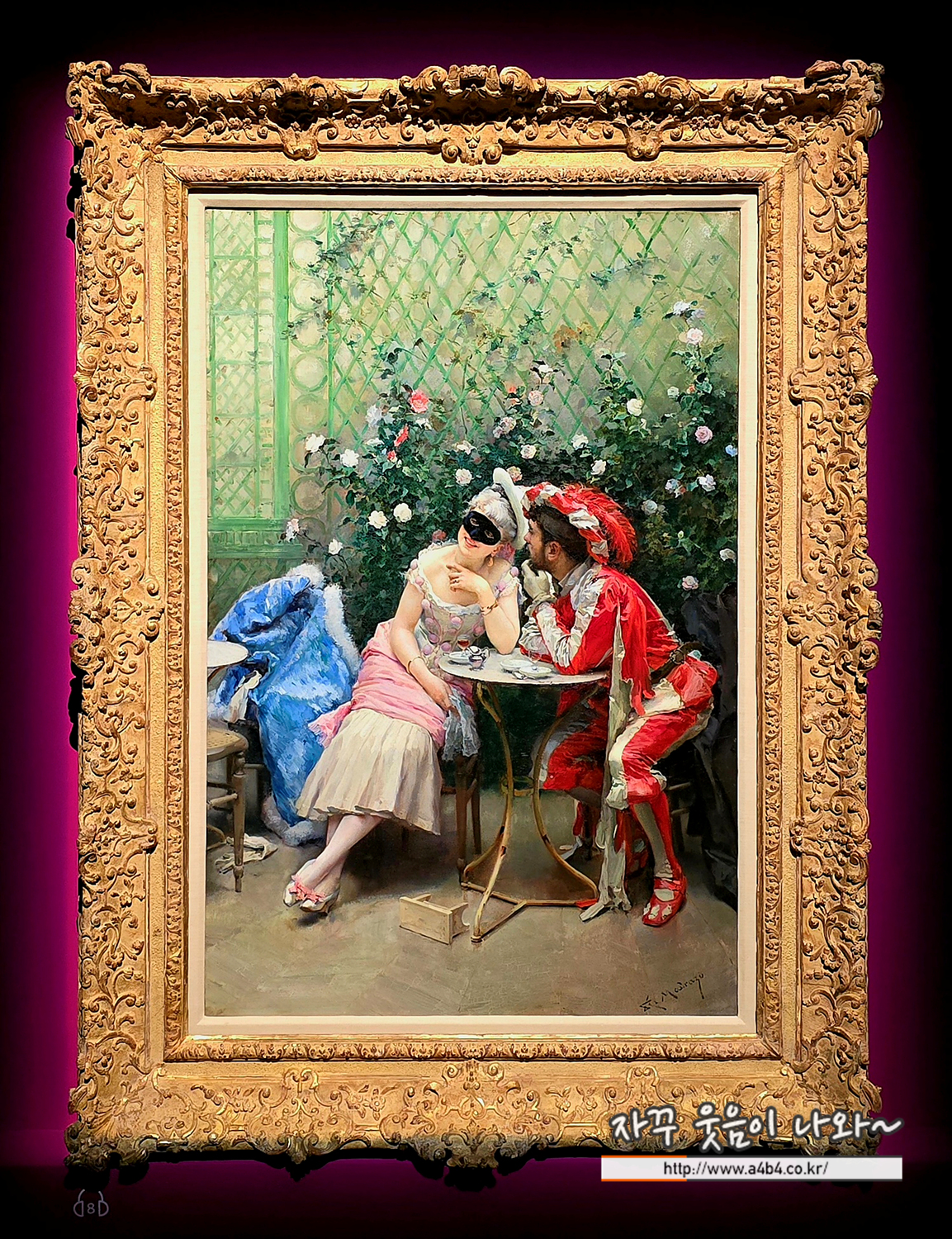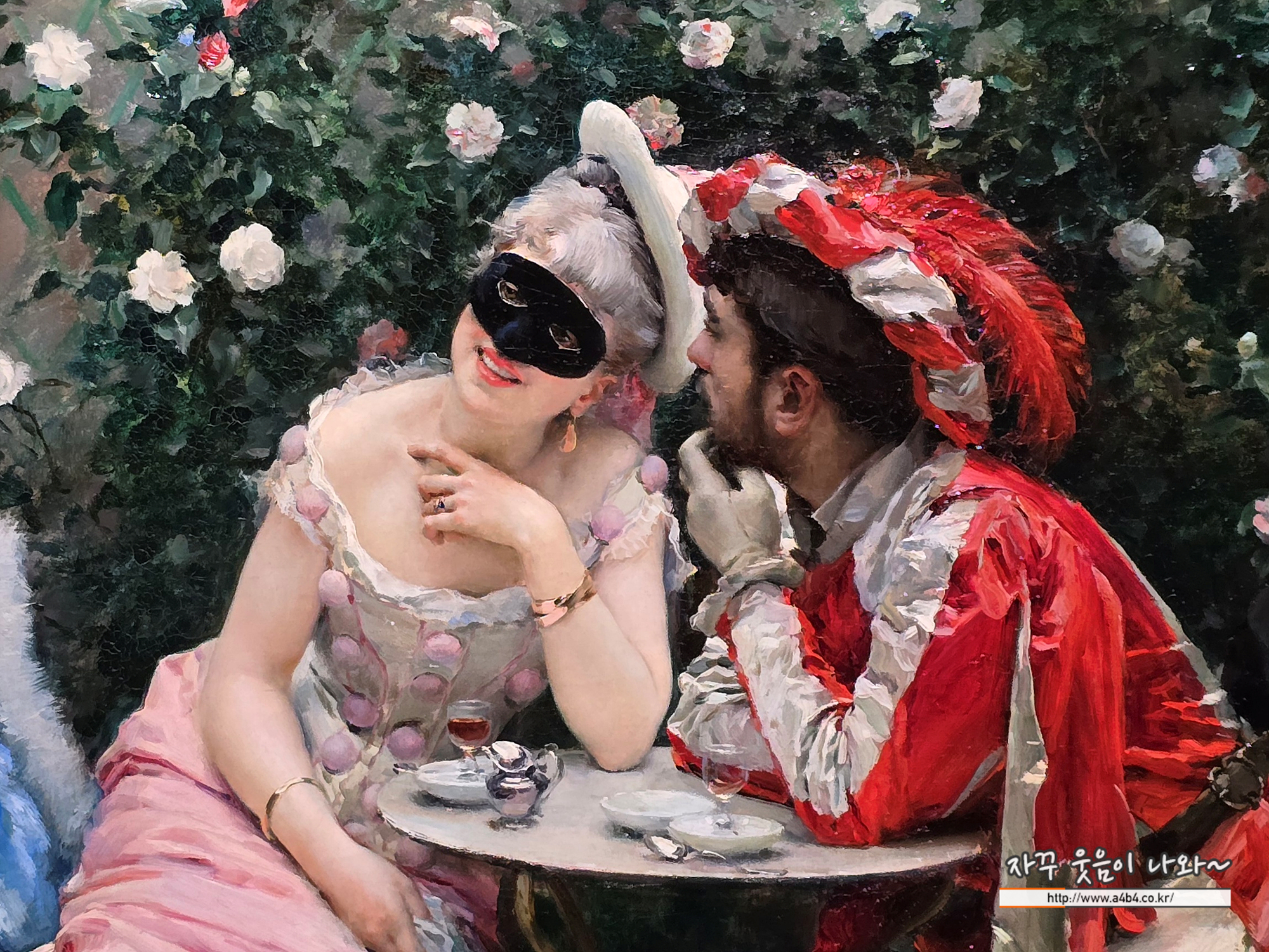 가장무도회에 참가한 남녀가 온실에 앉아 잠시 둘만의 시간을 즐기고 있다. 화려한 옷차림, 대리석 테이블 위의 병과 그릇, 활짝 핀 꽃들이 어우러져 장면은 쾌활하고 생동감 있게 느껴진다. 세밀한 질감 표현에서 화가의 뛰어난 솜씨가 드러난다.