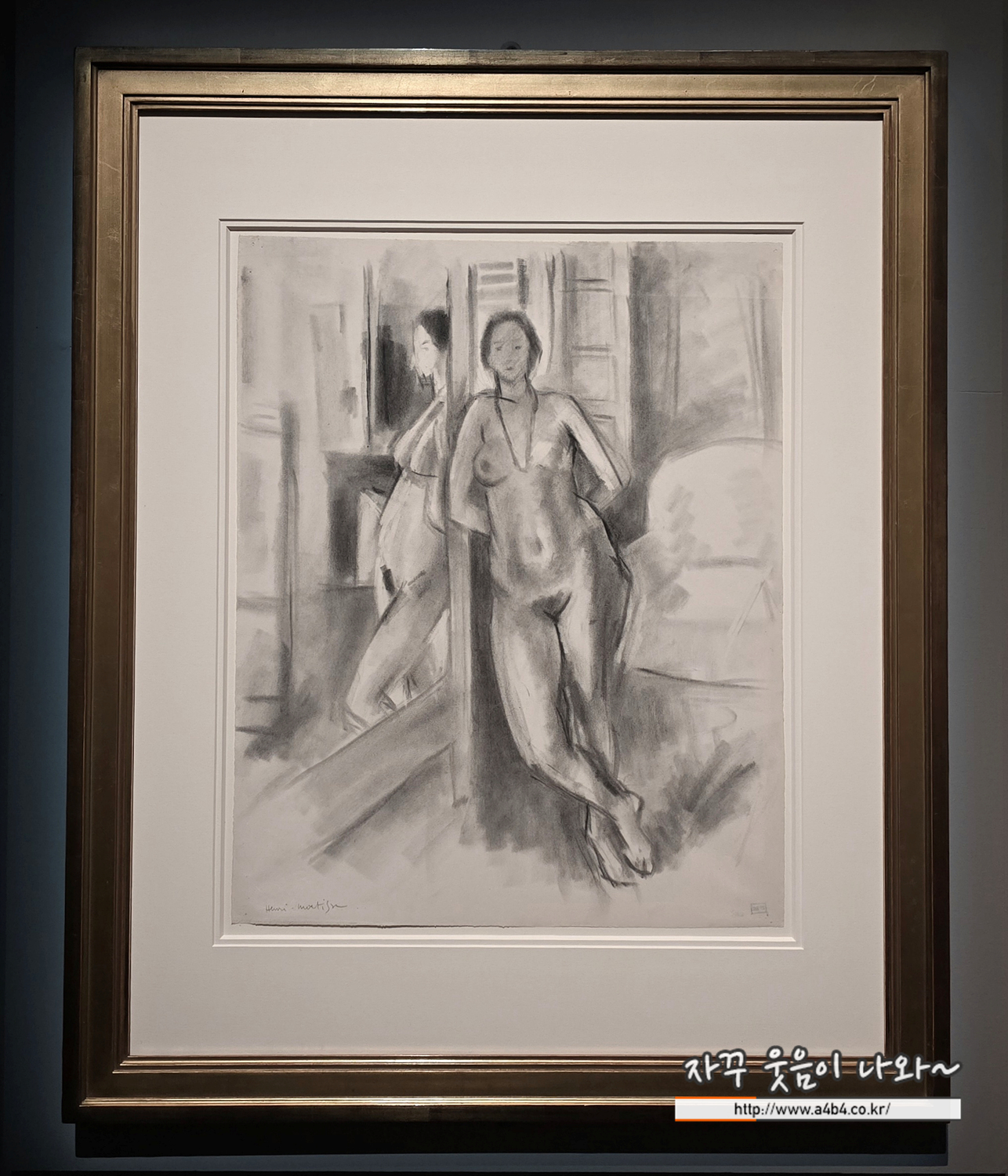 목탄을 사용해 전신 거울에 기댄 여성의 누드에서 빛과 그림자의 효과를 탐구한 작품이다. 앙리 마티스는 재료를 능숙하게 다루며, 검은 선과 여러 색조의 회색을 번지게 한 그림자, 빛을 강조한 흰색으로 인체의 견고함을 효과적으로 표현했다. 단단해 보이는 여성의 몸이 그림 전면을 채우고, 거울에 비친 모습은 빛의 대비 효과를 만들어낸다.