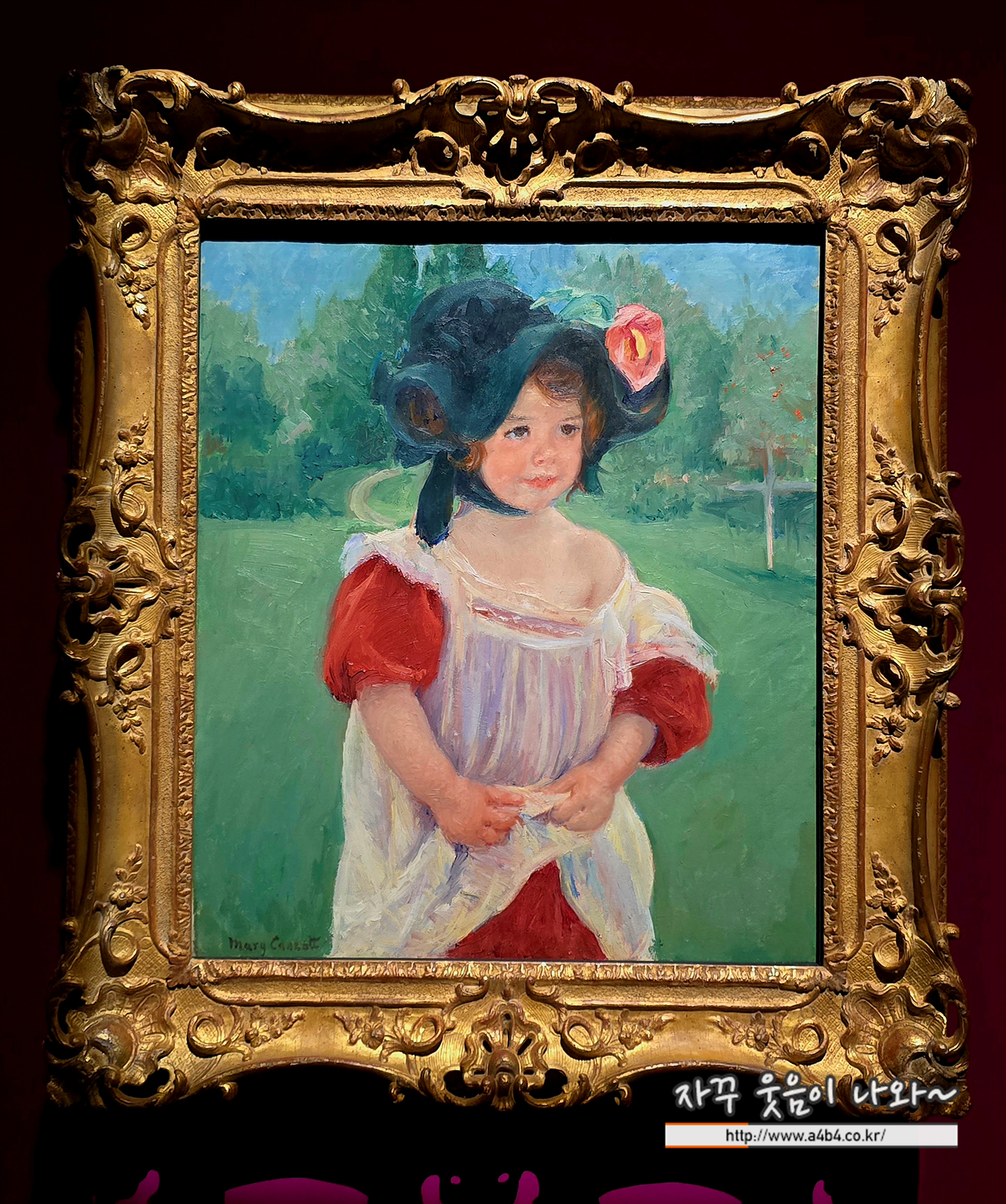 한 소녀가 앞치마를 꼭 쥔 채 서 있다. 흘러내린 옷으로 드러난 어깨와 통통한 손이 사랑스럽다. 모델은 파리 교외에 살던 화가 메리 커샛의 이웃, 마고 뤽스였다. 하지만 커샛은 특정 인물로서의 마고가 아니라, 당시 파리 부르주아 계층 소녀의 일상적인 모습을 담아내고자 했다. 1890년대 이후 커샛은 어린이를 자주 그리며, 아이의 순수함과 자유로움을 표현했다. 그녀의 시선에는 어린이가 지닌 보편적인 순수성과 시대적 분위기가 함께 담겨 있다.