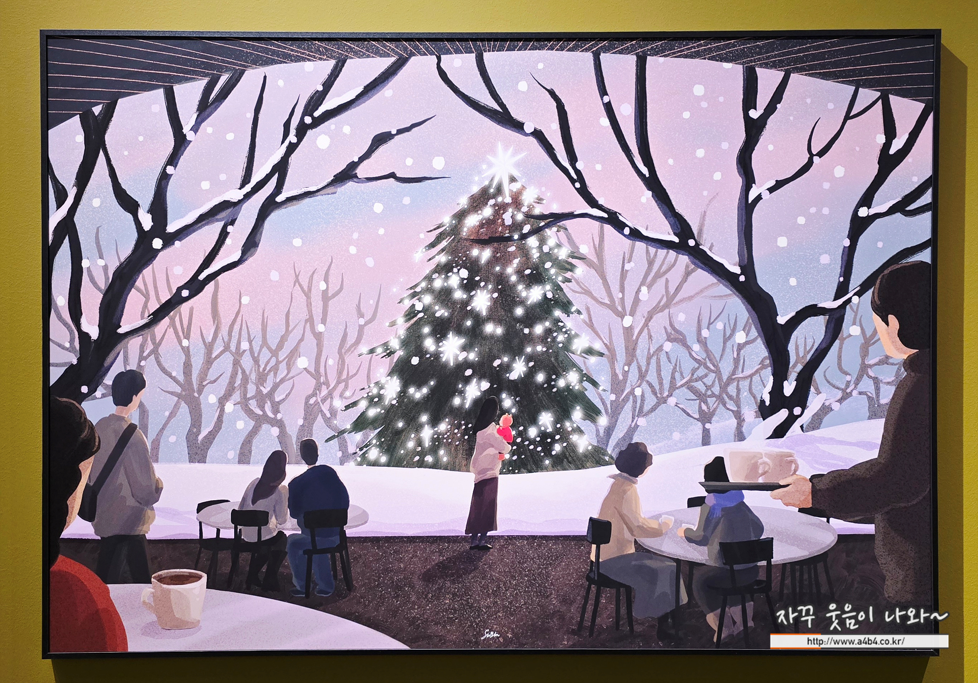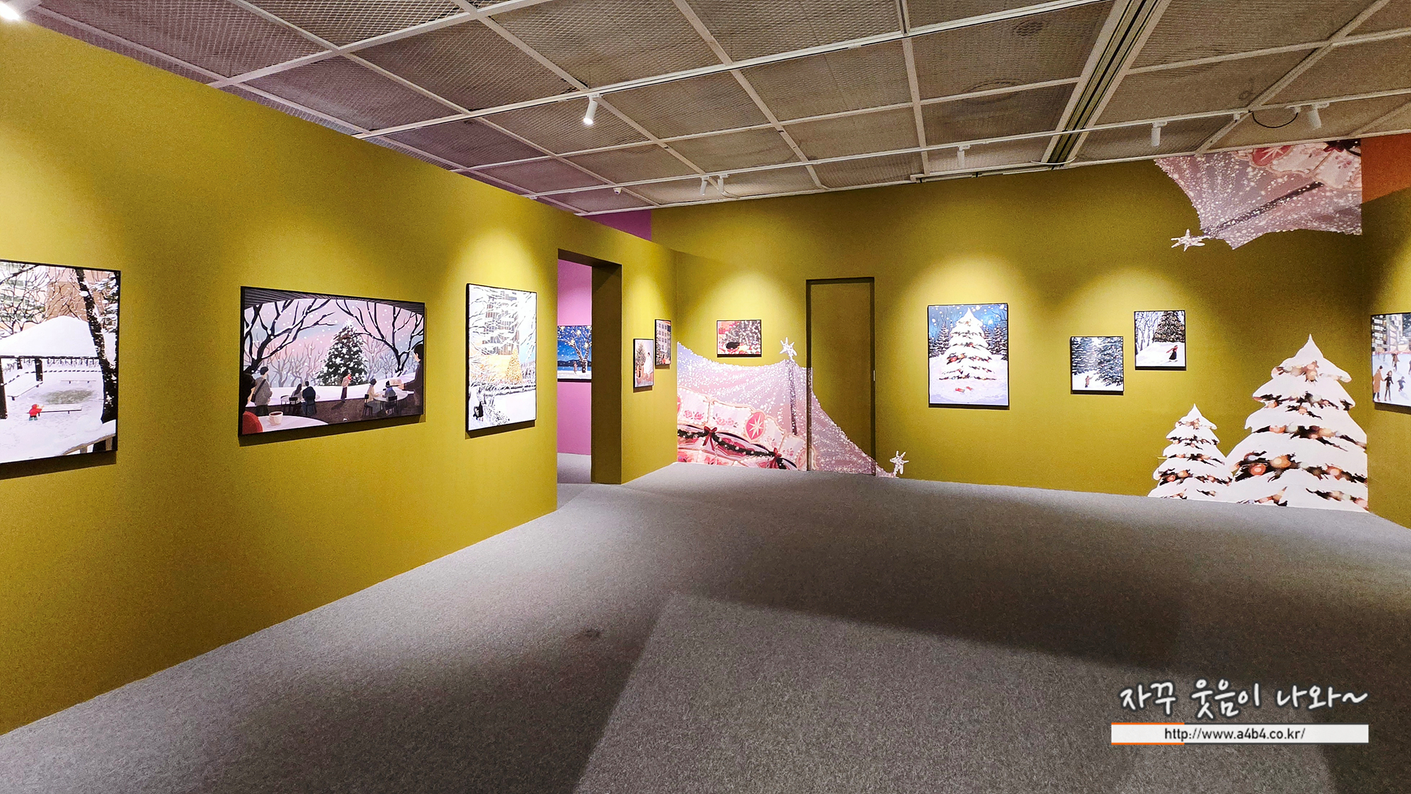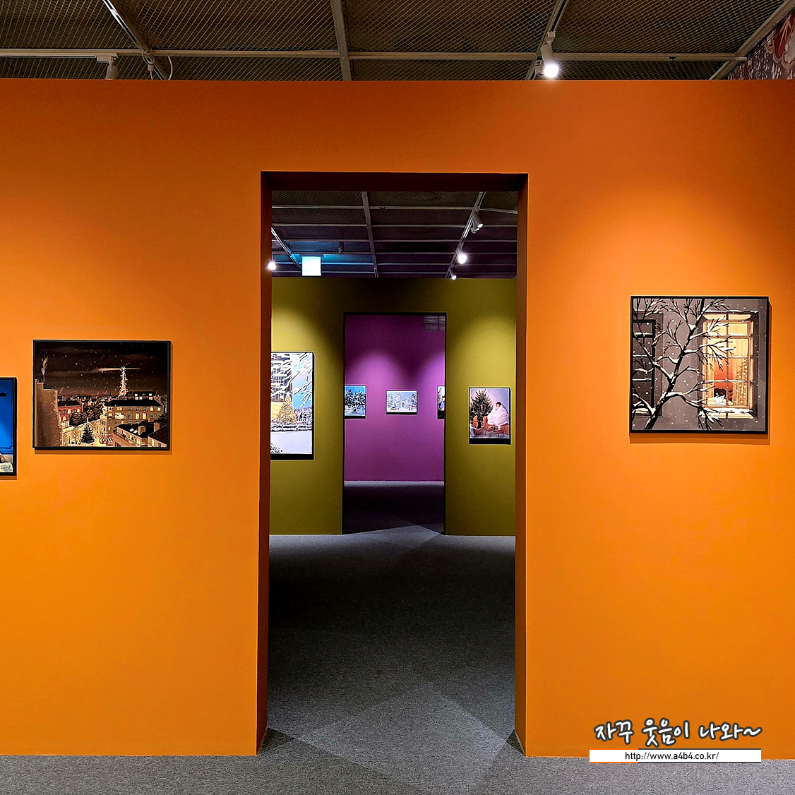 겨울,그 따뜻한 순간들 전시회 전시장 구성은 중앙에 대형 포토월이 설치되어 있고 수빈, 배성규, 아레아레아 작가 3명의 작품이 전시된 각각이 방으로 구성되어 있습니다. 어느 방부터 먼저 들어가도 방은 모두 연결되어 있고요. 배성규 작가 또는, 아레아레아 작가 방에서 시작하시면 연속해서 관람이 가능합니다.