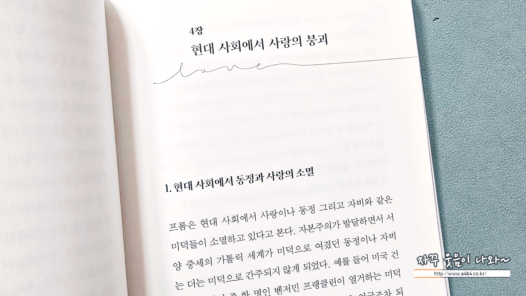 참 마음에 드는 제목. 나는 에리히 프롬의 '사랑의 기술' 읽기는 책의 후반부 보다는 전반부 내용이 더 마음에 든다는, 뒷 부분은 다소 집중력이 떨어지는... 주말에 집에서 책의 앞부분은 몰입도 높게 읽어나갈 수 있었다.