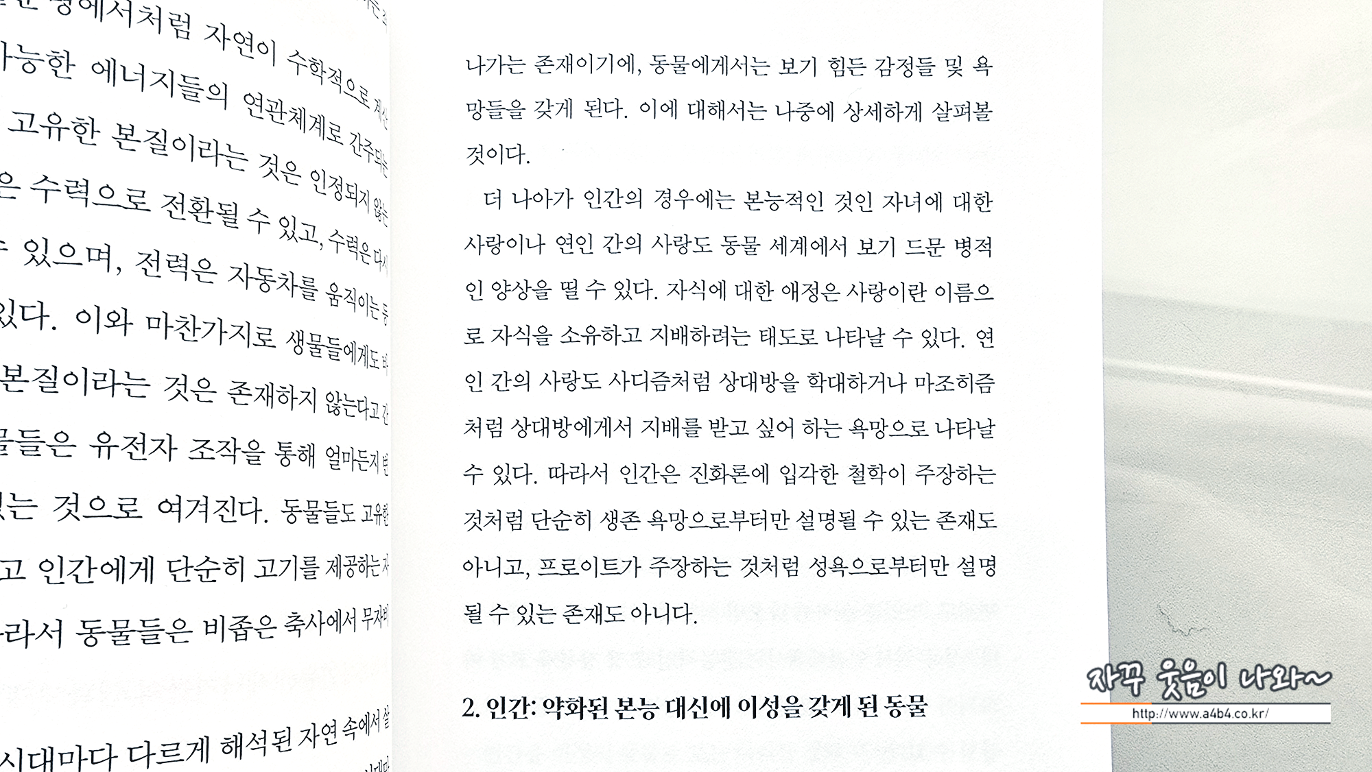 “더 나아가 인간의 경우에는 본능적인 것인 자녀에 대한 사랑이나 연인 간의 사랑도 동물 세계에서 보기 드문 병적인 양상을 띨 수 있다. 자식에 대한 애정은 사랑이란 이름으로 자식을 소유하고 지배하려는 태도로 나타날 수 있다. 연인 간의 사랑도 사디즘처럼 상대방을 확대하거나 마조히즘처럼 상대방에게서 지배를 받고 싶어하는 욕망으로 나타날 수 있다. 따라서 인간은 진화론에 입각한 철학이 주장하는 것처럼 단순히 생존 욕망으로부터만 설명될 수 있는 존재도 아니고, 프로이트가 주장하는 것처럼 성욕으로부터만 설명될 수 있는 존재도 아니다.”