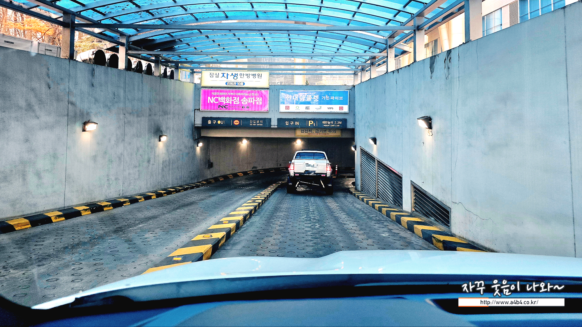 가든파이브 주차장 진출입 난이도는 중간정도 입니다. 우선 진출입로 도로 폭이 여유있지 않고요. 또한 급커브와 급경사, 코너간 기둥들이 있습니다. 운전이 미숙한 분들은 상당히 당황할 수 있는 주차장 환경입니다.
