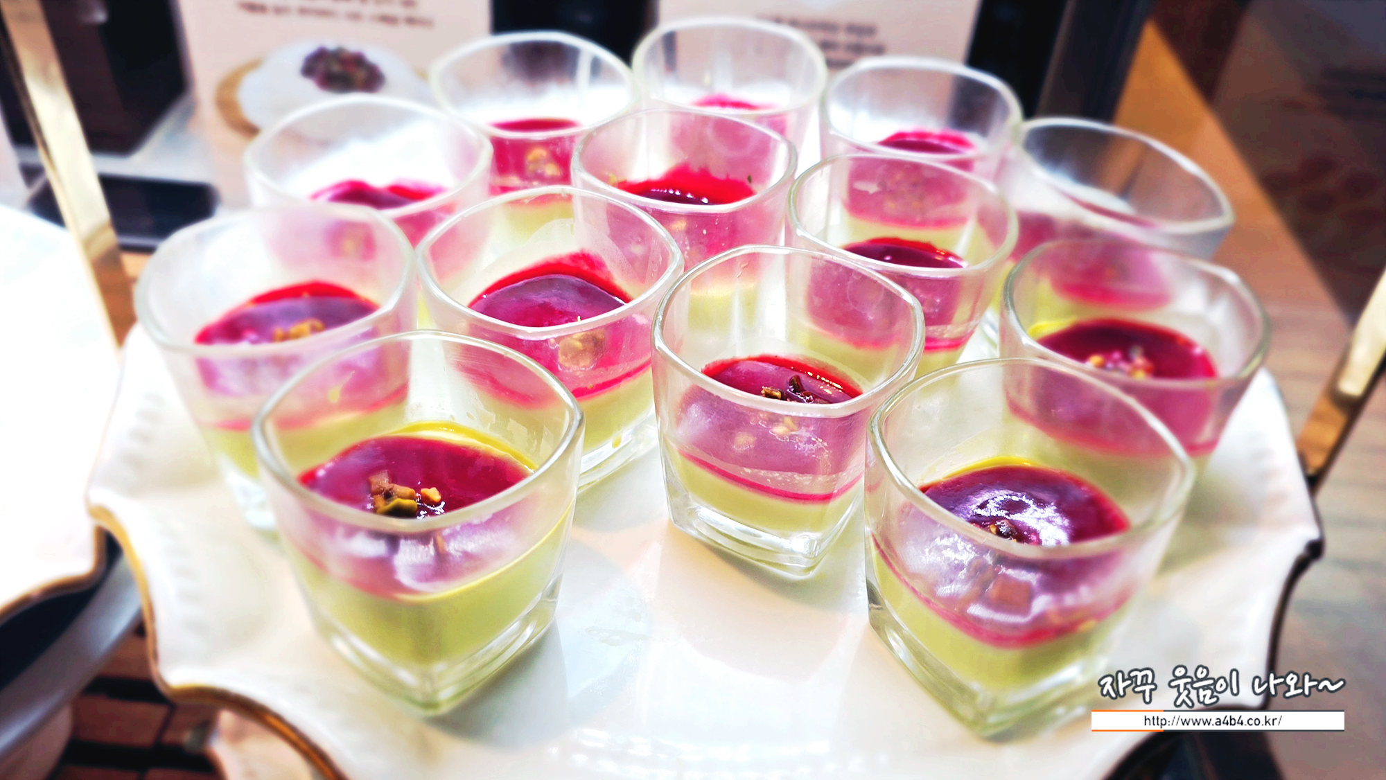 케이크 4종과 푸딩 1, 과일과 탄산음료, 아이스크림, 커피 있네요.