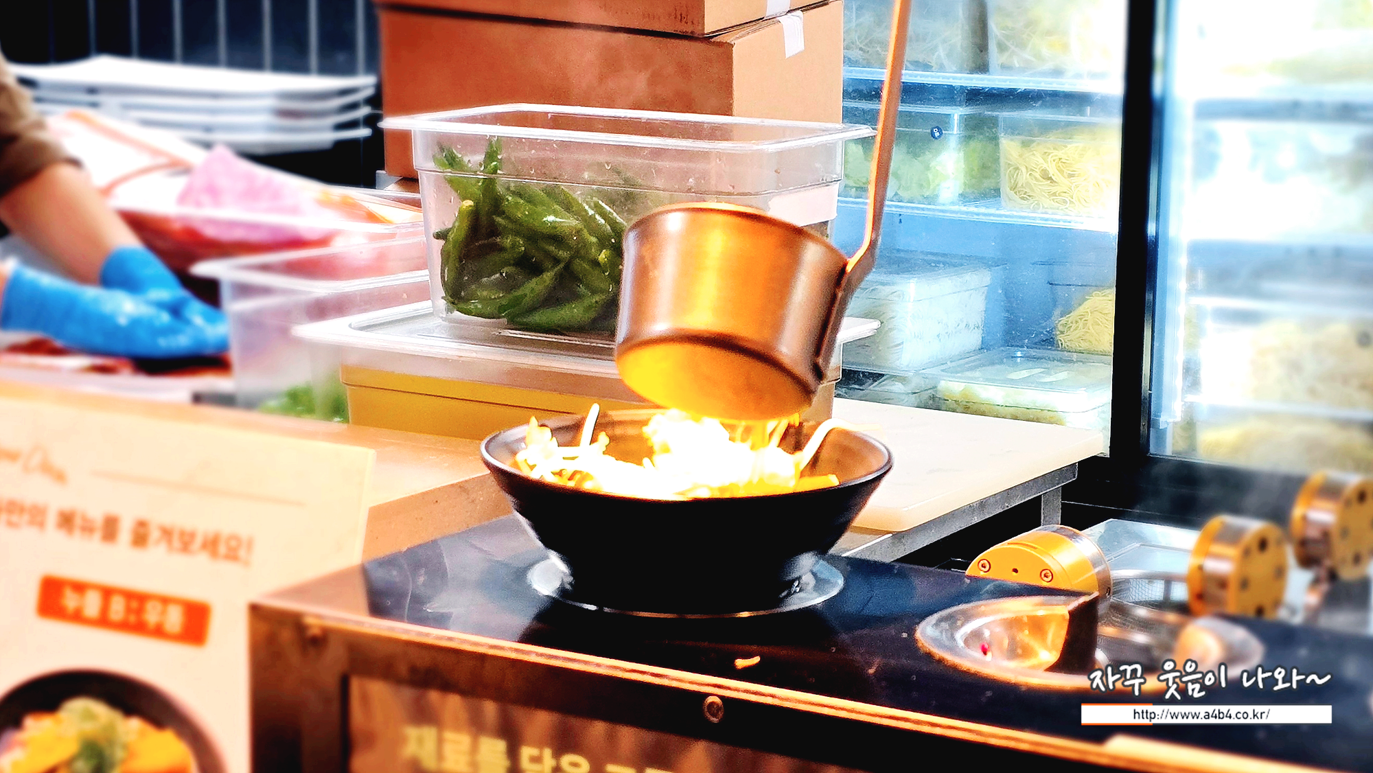 다음 코너는 빕스 누들코너입니다. 즉석으로 취향에 맞춰 우동이나 쌀국수 조합이 가능한데요. 로봇이 조리해 줍니다.