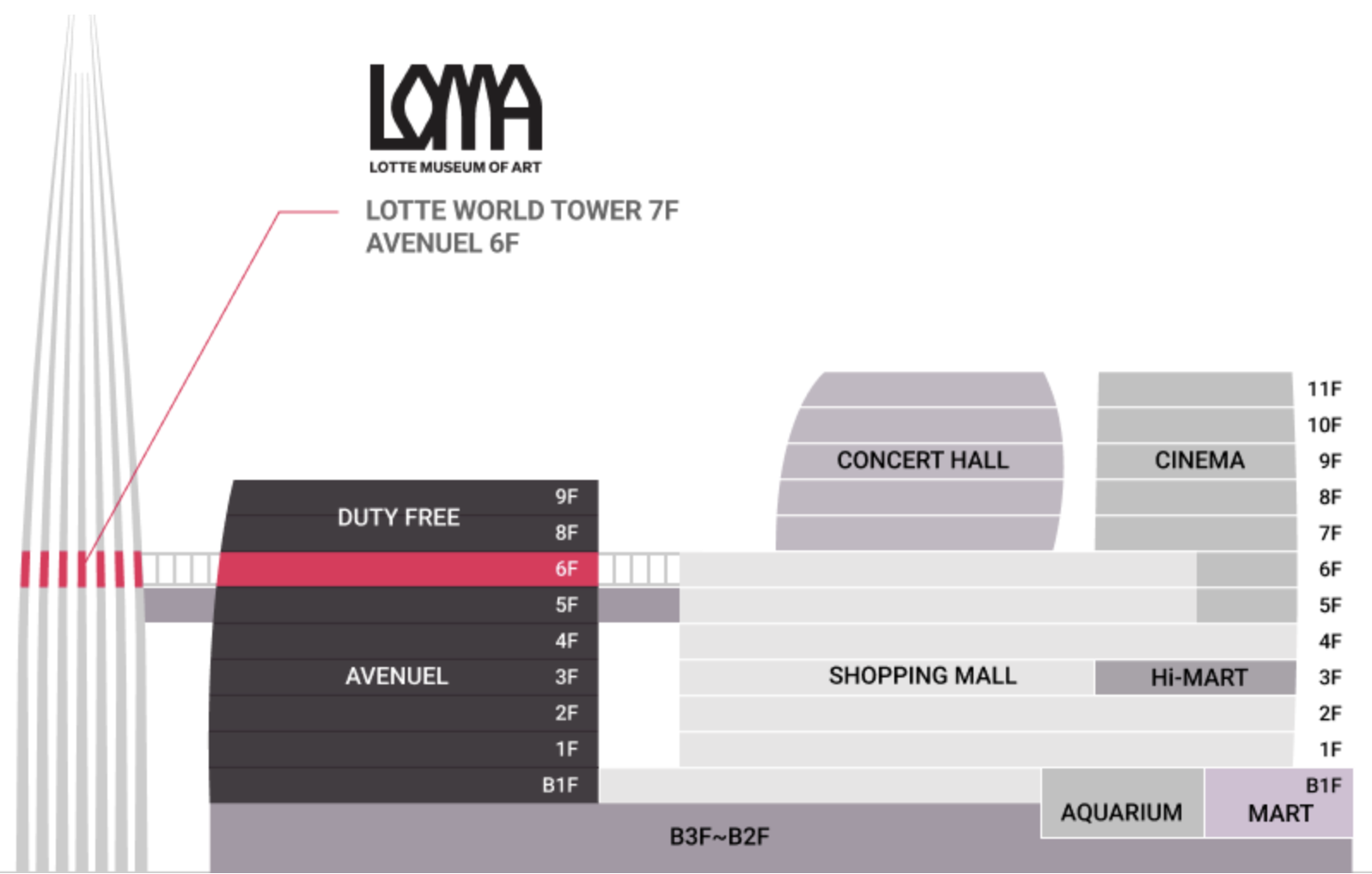 롯데뮤지엄 위치는 롯데월드타워 7층에 있습니다. 신기하게도 바로 옆 에비뉴엘 6층과 연결되어 있습니다. 지하철로 방문하신다면 2호선 잠실역 1, 2번 출구로 나오시면 가장 빠르게 오실 수 있습니다.