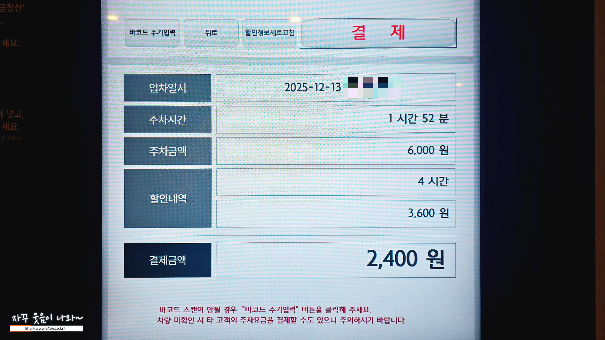 이렇게 바코드 할인 슬롯에 티켓 인식하시면 롯데뮤지엄 주차요금 할인 처리되는데요. 웹페이지나 하이패스에서 주차요금 할인하려면 티켓하단 17자리 바코드를 다 입력해야 합니다. 결코 추천하지 않는 방법