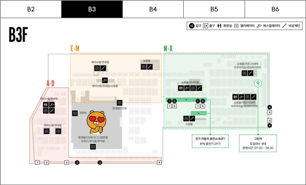 아래 지도에서 라이언이 있는 공간이 바로 롯데뮤지엄이 있는 롯데월드타워오 연결된 공간입니다. 가능한 해당 구역 근처 주차하는 것을 추천 드립니다. 다만 주말이나 공휴일의 경우 주차난이 워낙 심해서 이것저것 따질 수 없고요. 대략 A~M 구역이면 만족하고 주차 하셔야 합니다.