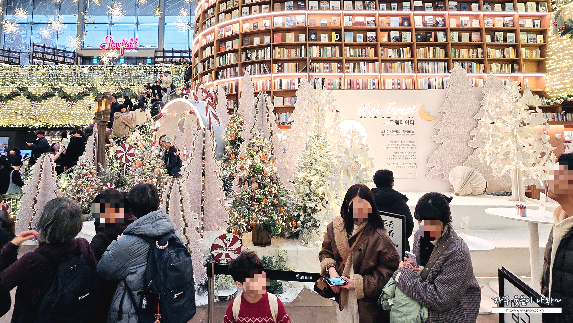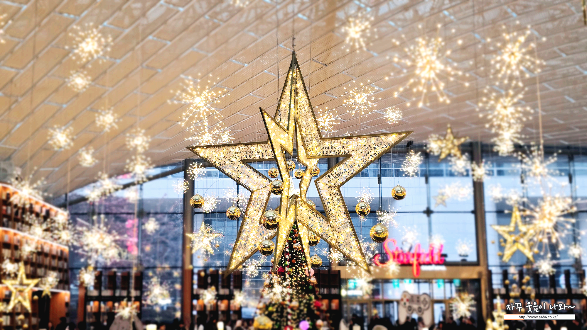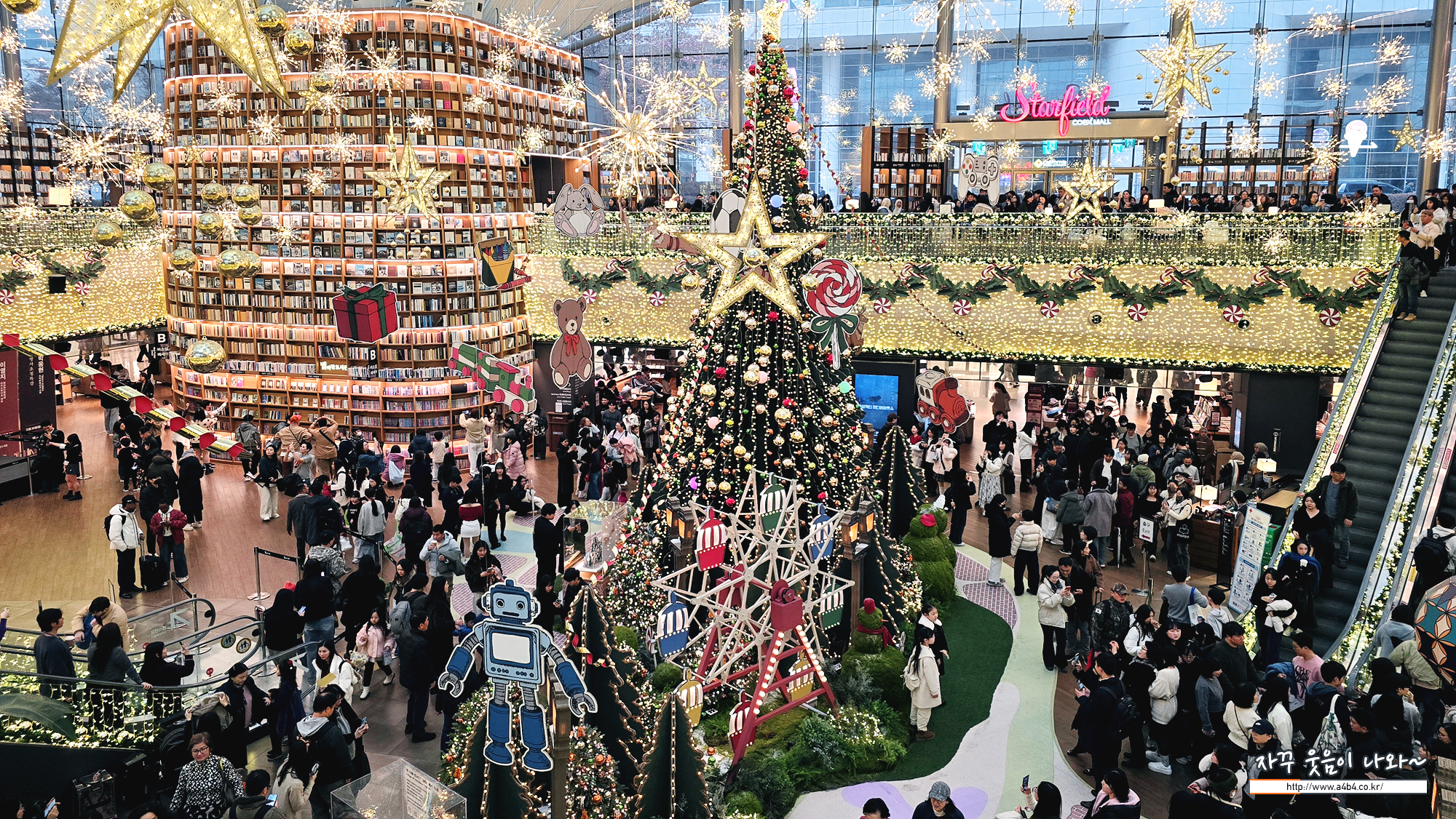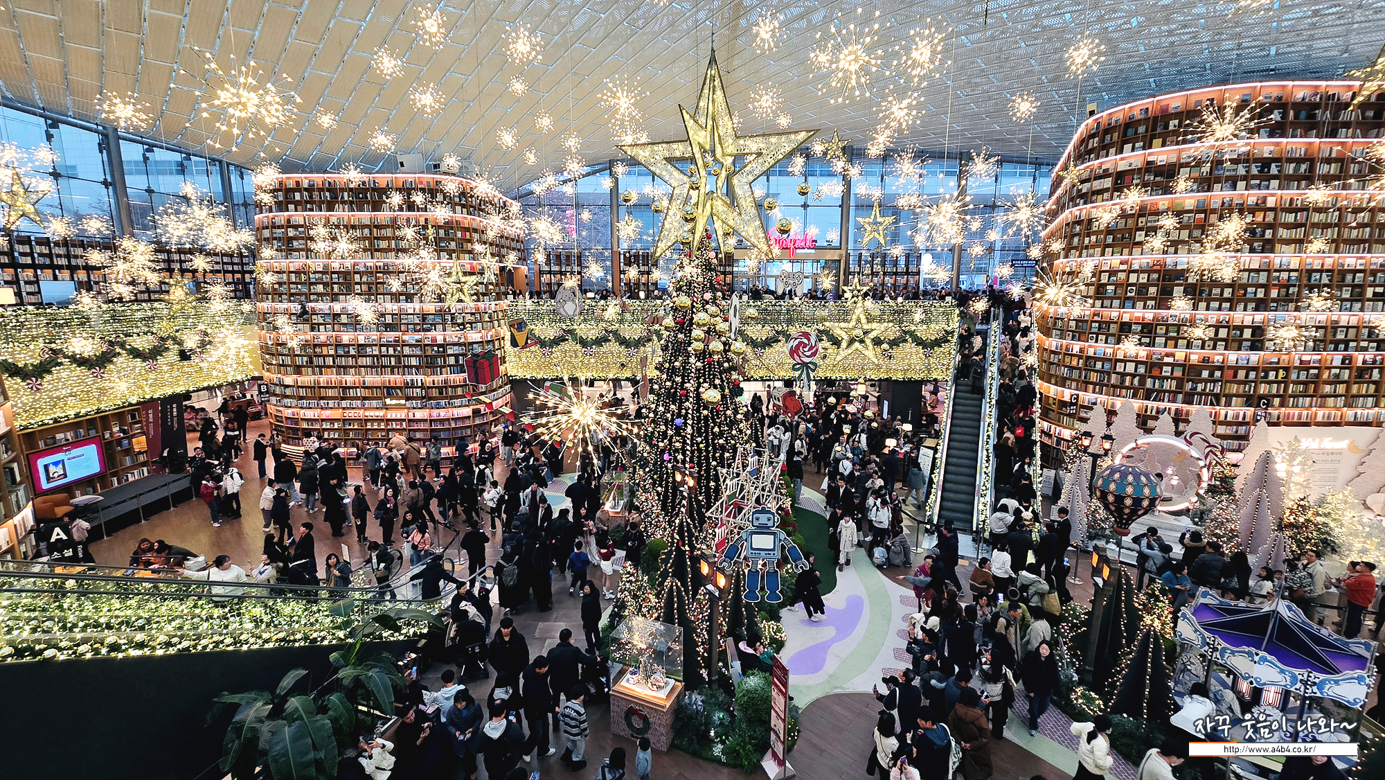코엑스 별마당도서관은 여러 방향에서 들어올 수 있고요. 도서관 중앙에 거대한 크리스마스 트리가 설치되어 있습니다. K컬쳐 영향인이 올해 별마당도서관 크리스마스축제에는 외국인 관광객이 더 많은 것 같네요. 특히 히잡을 두른 동남아로 추청되는 관광객들이 엄청나게 많네요.