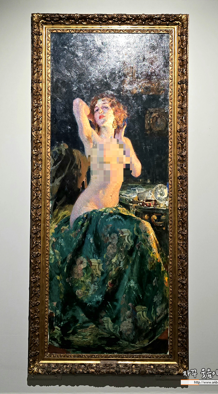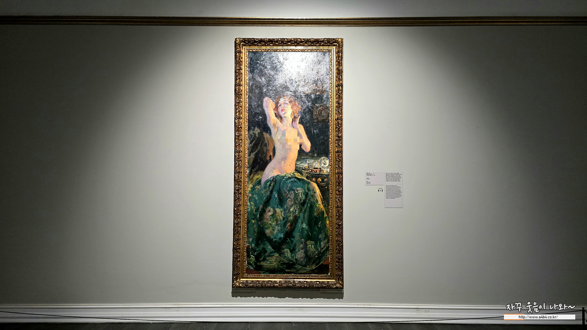 자코모 그로소는 20세기 초 이탈리아에서 활동한 화가로, 부르주아 초상화로 널리 알려져 있습니다. <거울 속>은 그의 원숙기 작품으로, 거울 앞에 선 나체의 여성을 담고 있습니다. 여인은 거울 속 자신을 또렷하게 응시하며, 짧은 머리와 반짝이는 귀걸이는 당시 새로 등장한 근대 여성상을 잘 보여줍니다.