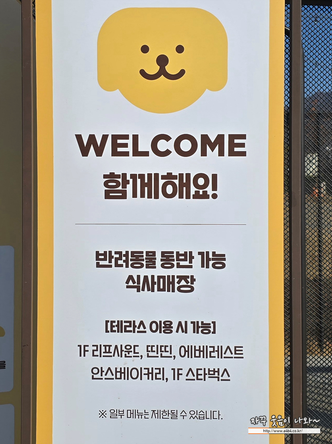 다만 리드줄만 있으면 입장 가능한 매장과 캐리어 또는 트롤리 개모차가 있어야 입장 가능한 매장으로 나누어 있으며 매장 입구에 아래와 같이 입장 불가여부와 조건이 안내되어 있습니다.