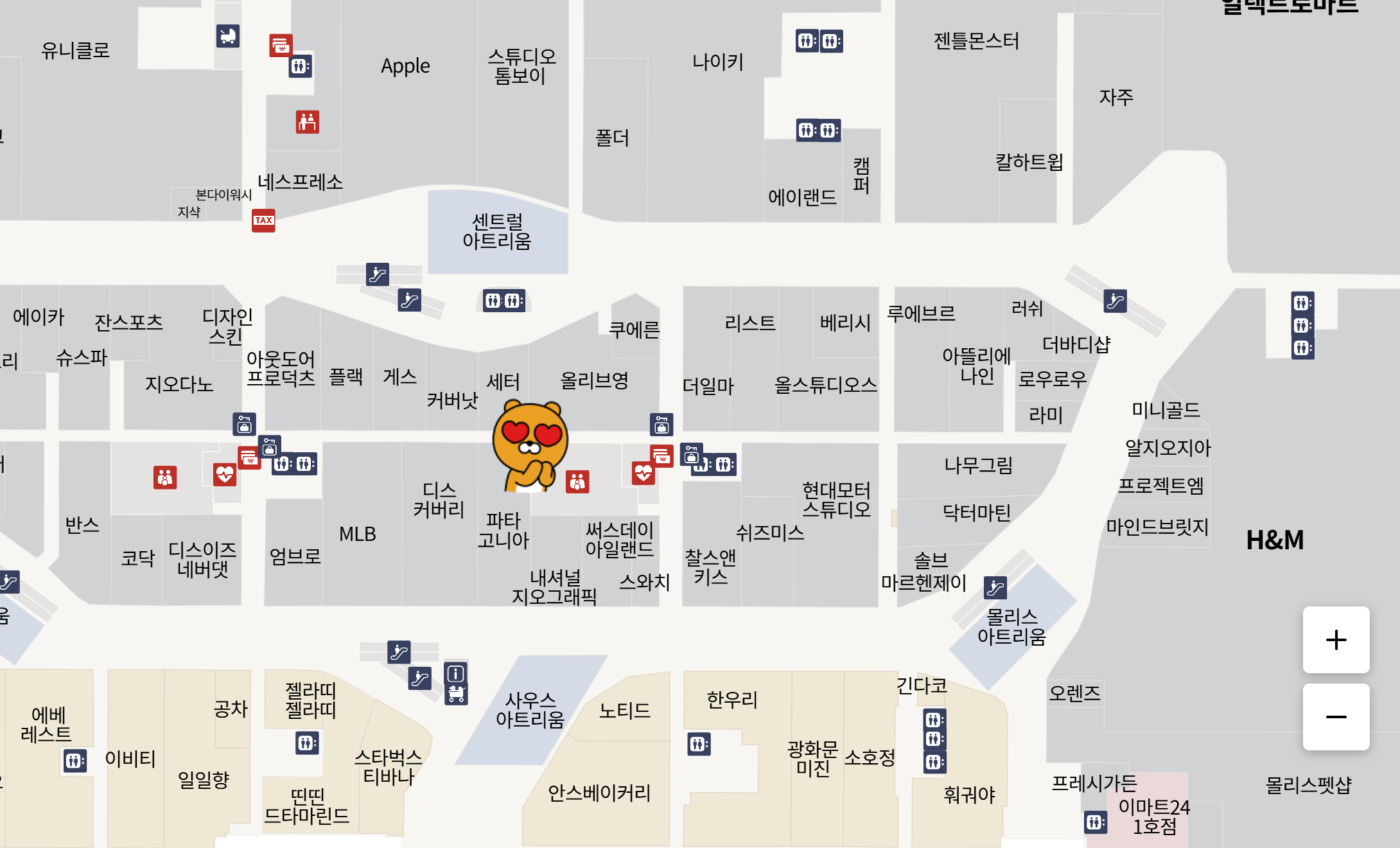 하남 스타필드 펫라운지 위치는 1층 스촤치와 찰스엔키스 쿠레른과 더일마 사이에 있는데요. 아래 지도에서 라이언이 있는 곳.
