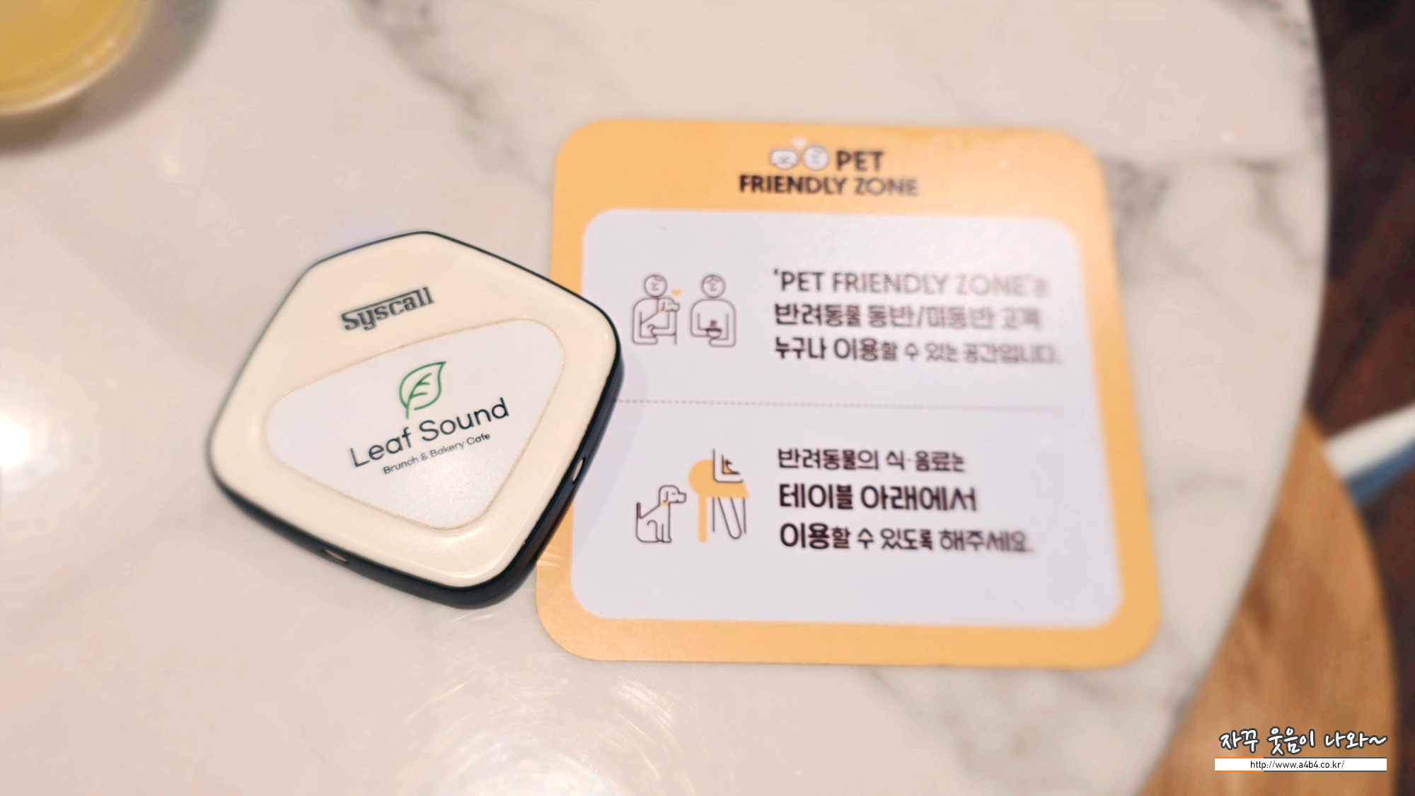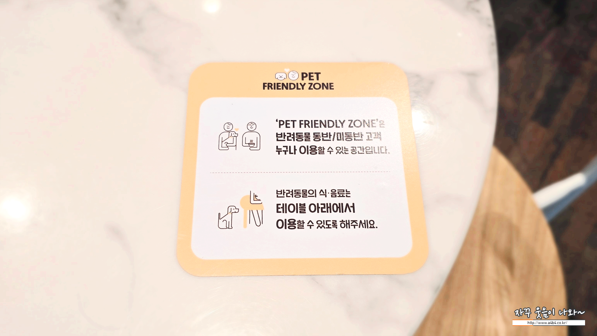 리프사운드 펫존입니다. 이곳에서는 강아지와 함께 불편없이 식사할 수 있는데요. 아래와 같이 테이블에 반려동물 동반 미동반 고객 모두다 이용할 수 있다는 안내표가 부착되어 있습니다.
