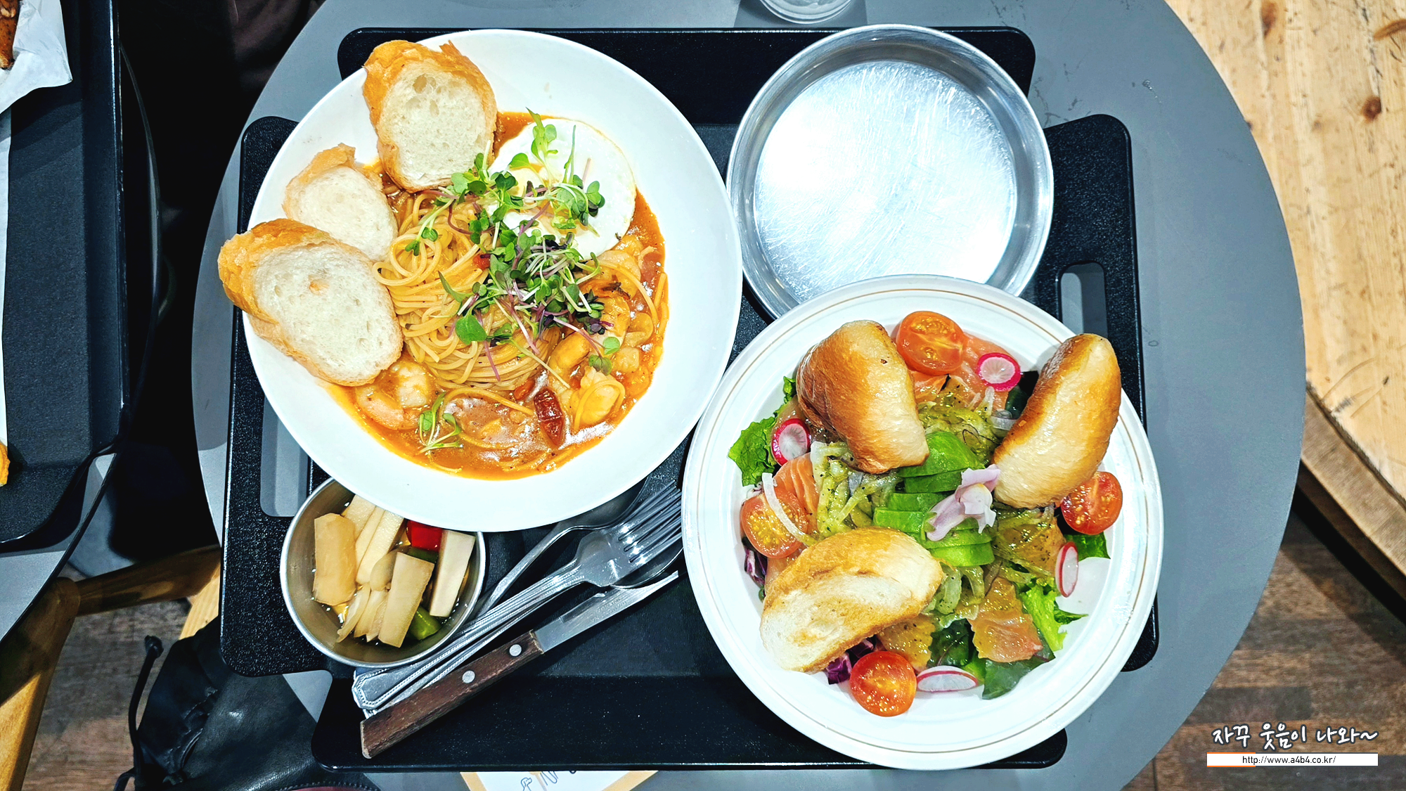 저희는 샥슈카 에그 인 헬과 연어 셀러드 주문 했습니다.